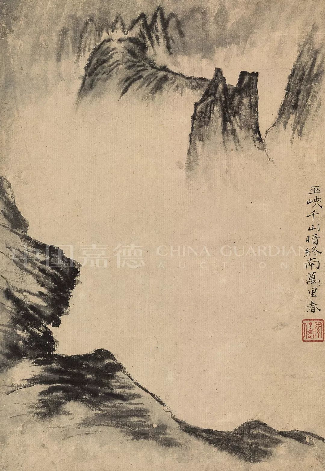 第二开尤奇,既不留天地,又不写长林茂草,光溜溜地巉岩与尖削破空的群峰直耸云天。山石都以破笔勾皴,再加淡墨晕染,使春日湿润的空气,弥散于崖间峰头,弥散于空阔的烟水之间。“巫峡千山暗,终南万里春。”欣赏石涛这幅画,读着图上的杜诗,我脑海中突然涌出了李白下三峡的经历。乘着早晨的彩云,踏上江边的轻舟;冲激浪,越险滩;眼前千重美景,耳边两岸猿啼;声光云影的变幻,造化神奇的刺激,如风驰电闪,转瞬即过。却铸成了诗人千古留芳的绝唱。李白七言诗、杜甫十个字,石涛一团云,给我们的启发是:不管是诗是画,无论是简单是复杂,留给观众的想象空间越大,艺术的感染力就越强。