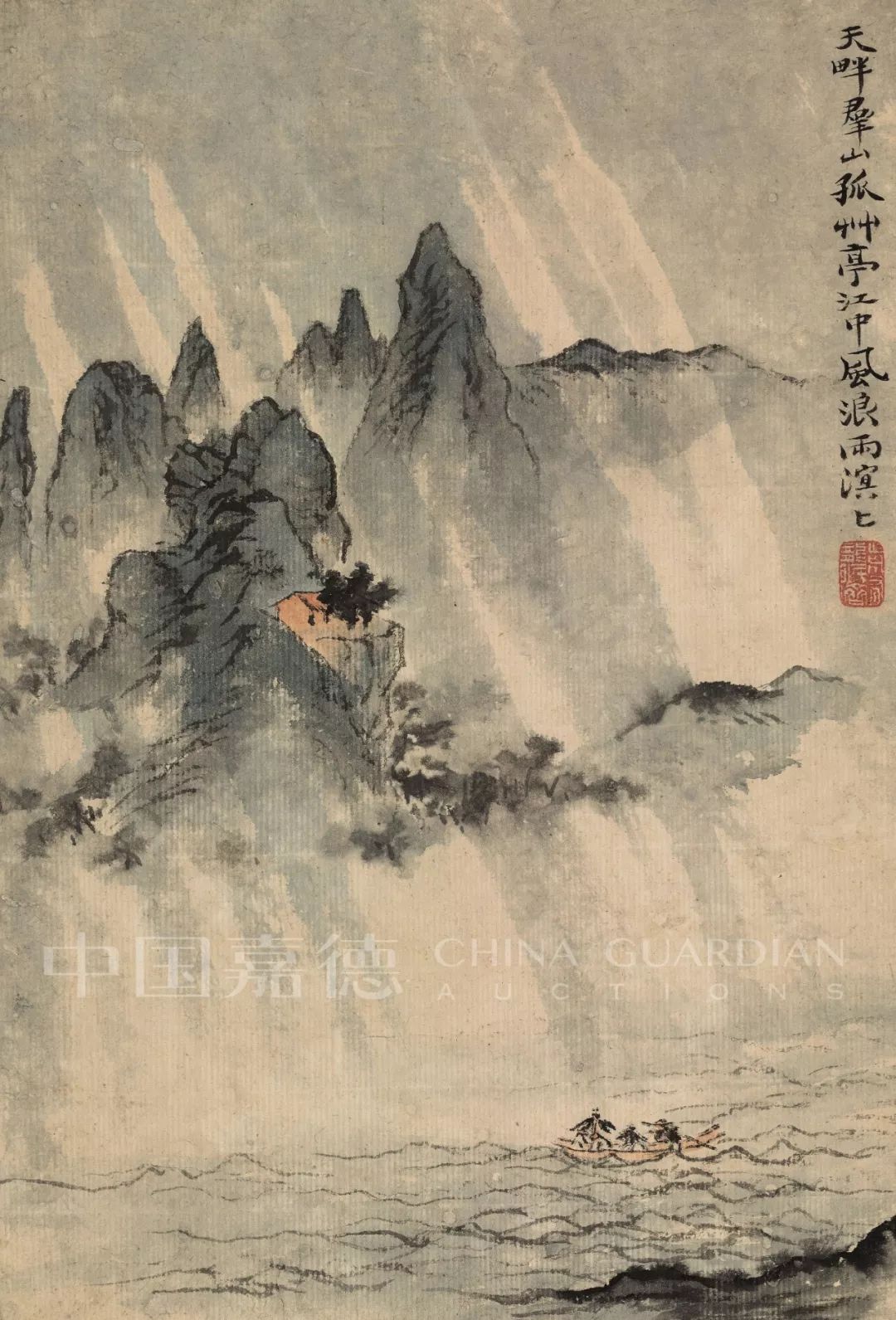 近处江面上波浪滔天,一小舟正挣扎着向对岸驰去,渡者撑着伞,不见江有多阔,岸有多远。石涛把近岸和孤舟都压缩在画面右下角,空虚着左方,把江流的阔远与无边的担忧留给了观众。构图不复杂,但构思却极为精妙。那用花青阔笔斜扫的雨丝风势,让我想起了傅抱石的《万竿风雨》等名作。傅先生是石涛的崇拜者,他当年在日本撰写《石涛年谱》时一定见到过这本《杜甫诗意图》,他斜扫风雨的技法,应该正是得到本幅的启发所至。