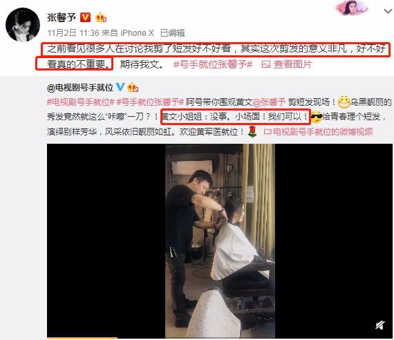 想必大家都知道,张馨予此前几乎都是以长发飘飘的形象示人,而为了出演《号手就位》,张馨予不惜将一头秀发剪掉,牺牲还是挺大的。不过在将长发剪短的过程中,张馨予却十分大气地表示“没事,小场面!我们可以”,敬业态度令人佩服。