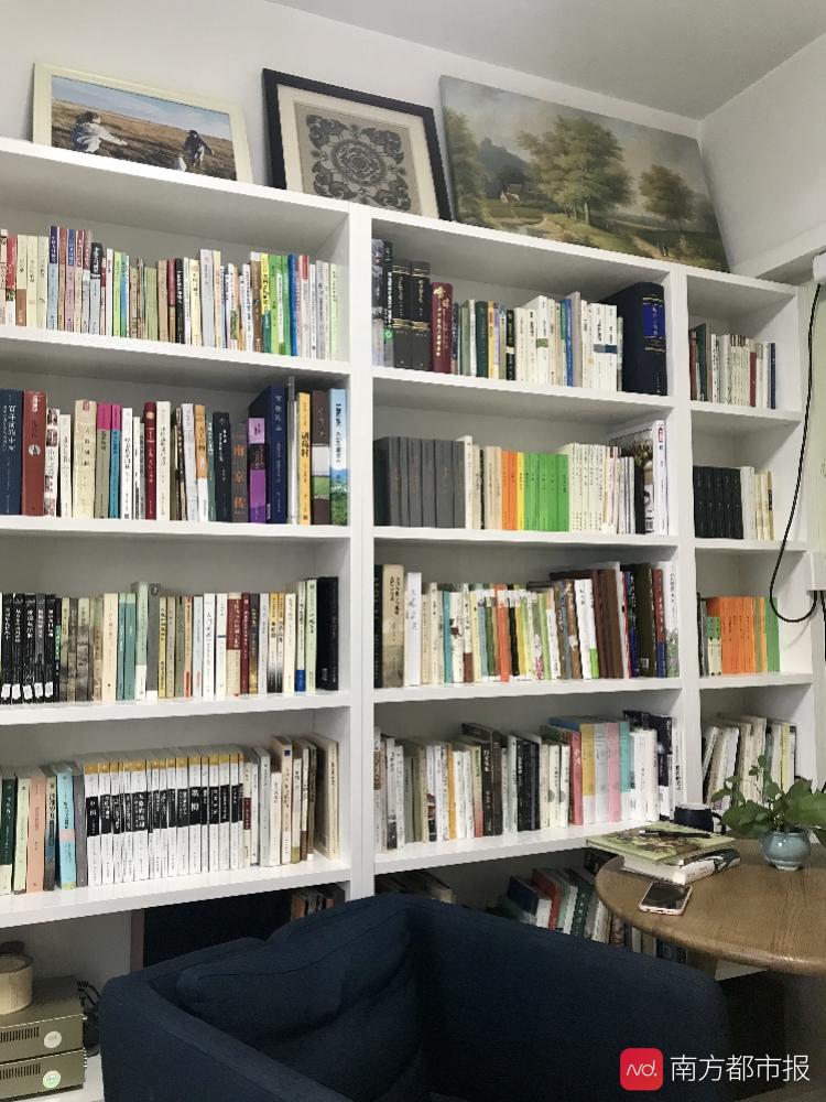 书房以白色为主调,书籍按分类整齐摆放:“书房一”是社会学、散文、诗歌、小说;“书房二”是历史、地理、生物学、植物学、博物学、人类学。