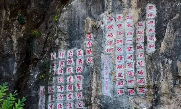 缘狮洞侧有开山景公所题的一首半字连珠句诗,即前一句诗的最后一个字的右半字为下一句诗的起首字。使人读来感到妙趣横生,全诗如下: