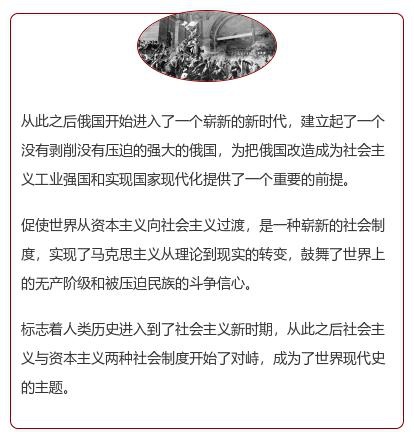 十月革命也结束了资本主义独占天下的局面,并为之后的社会主义阵营的建立奠定了基础。