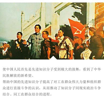 毛泽东在1949年写了一段这样的论述:"十月革命一声炮响,给我们送来了马克思列宁主义。十月革命帮助了全世界的也帮助了中国的先进分子,用无产阶级的宇宙观作为观察国家命运的工具,重新考虑自己的问题。走俄国人的路——这就是结论。"