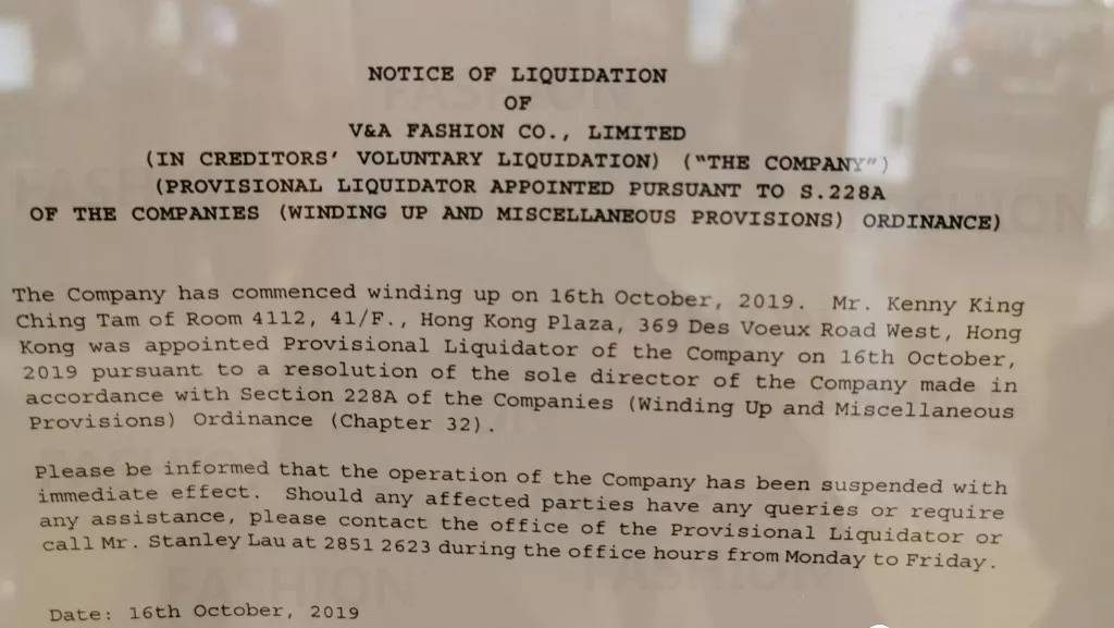 V&A FASHION清盘通知