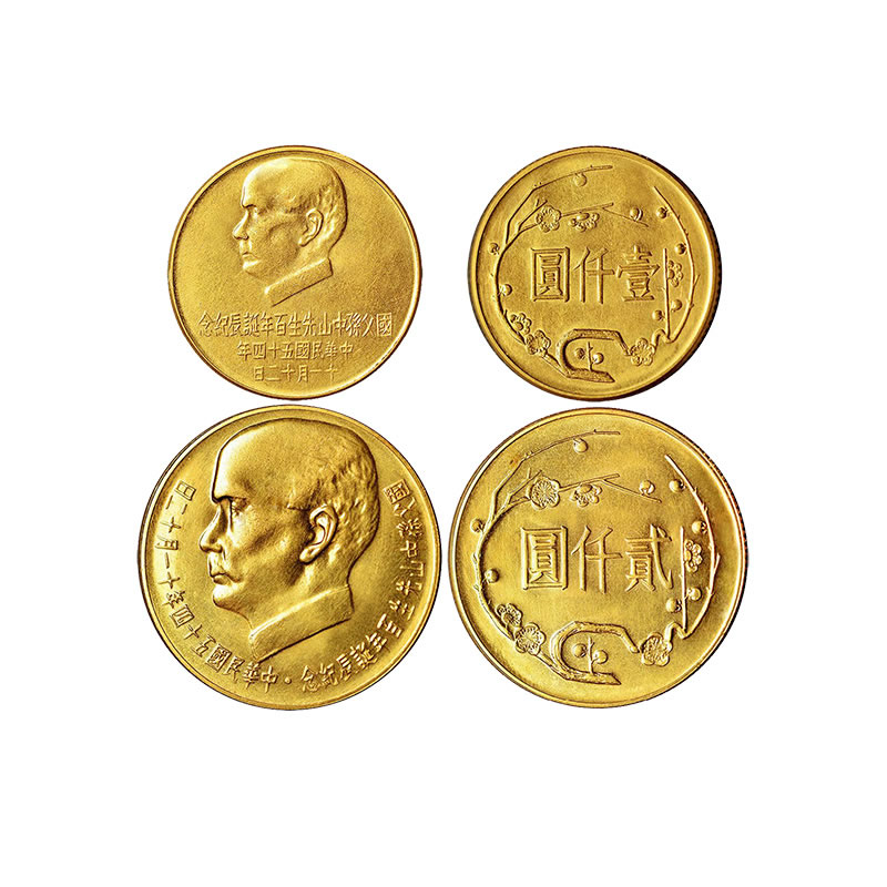 民国五十四年国父孙中像百年诞辰纪念金币壹仟圆、贰仟圆各一枚。