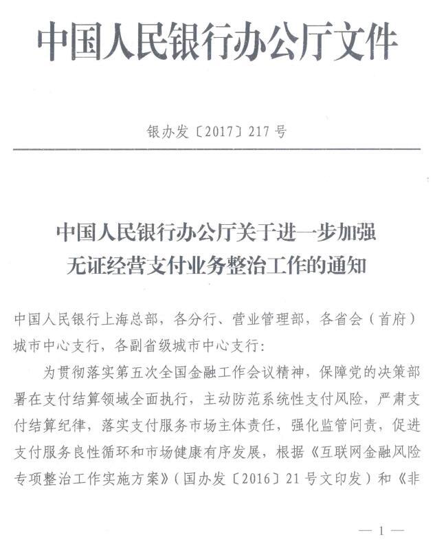 2017年11月,为防范系统性支付风险,促进支付服务良性循环和市场健康有序发展,彻底消除“二清”毒瘤,央行再次下发《关于进一步加强无证经营和支付业务整顿的通知》,并出具经认证的支付机构自检内容。217号文件坚决切断无证机构支付业务渠道,遏制支付服务市场乱象,杜绝支付服务市场违规行为。12月,我行发布《关于规范支付创新业务的通知》(银监发2017第281号),进一步规范支付创新,零扣率、刷卡和套现将被视为违规行为。