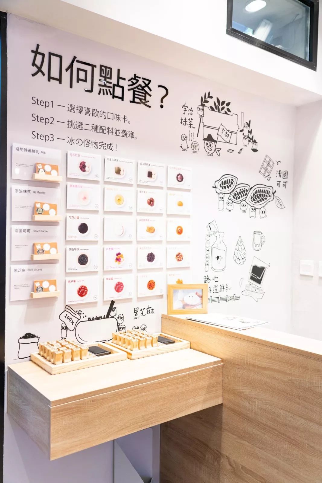 怪物冰只有四种口味、黑芝麻、宇治抹茶、特选鲜乳、法国可可。每种味道各有特色,各位小可爱们可以选择自己喜欢的口味,价格都是一样的哦~