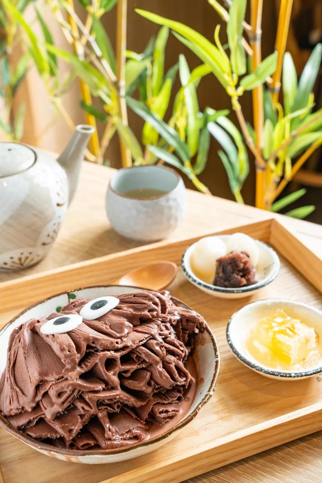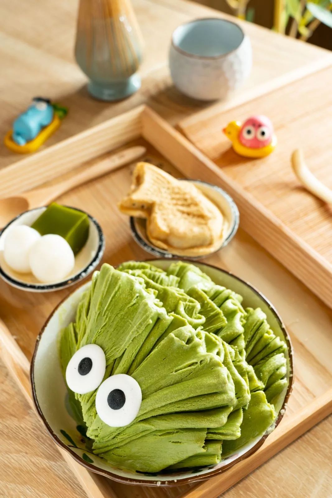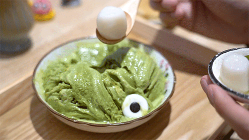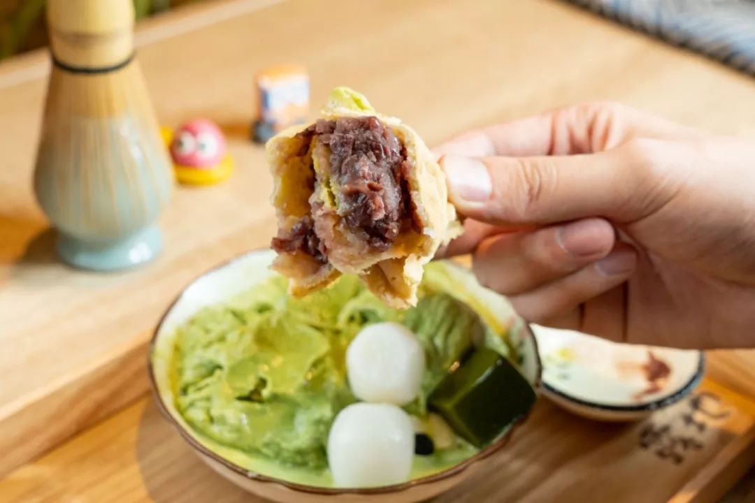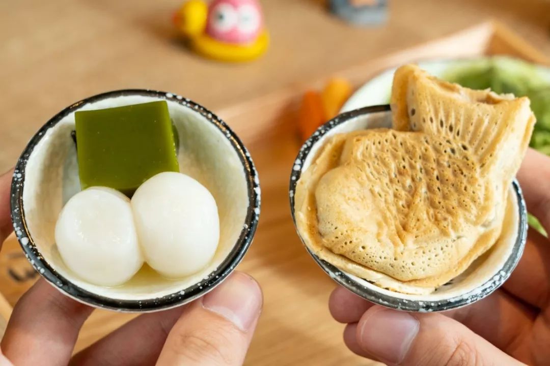 别忘记把两种配料也加进去,推荐搭配白玉抹茶冻和鲷鱼烧!软糯白玉丸子和抹茶冻吃起来有三重口感,随意一勺都能感受到清凉。