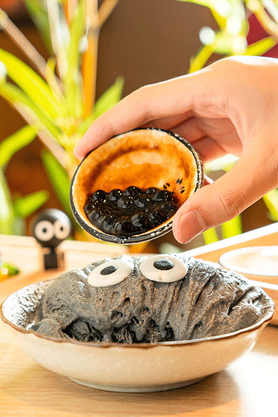 淋上黑糖珍珠,再满满的挖上一大勺,怪物冰干爽清凉的滋味和黑糖珍珠的软绵Q弹结合起来,口感丰富多样,让人忍不住大口吃起来!