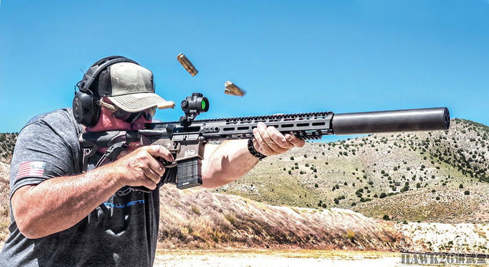 安装“巨人”消音器后,使用.458 SOCOM口径的AR步枪进行全自动射击会怎么样?要知道有的消音器连单发都不能承受,更不要说连发射击了。在测试中,轻松进行三发点射,完全没有可靠性问题。这种性能出色的大口径消音器建议零售价为999美元,约合人民币6986元。