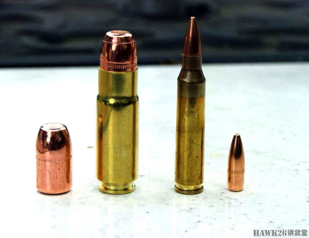 笔者2011年购买了这款步枪,对其巨大的杀伤力印象深刻。右侧就是AR-15通常配备的5.56×45mm弹药,左侧就是笔者步枪所用的.458 SOCOM弹药。从弹丸的对比可以直观感受到两者之间的明显区别,两者巨大的杀伤力差距能够推测出来。