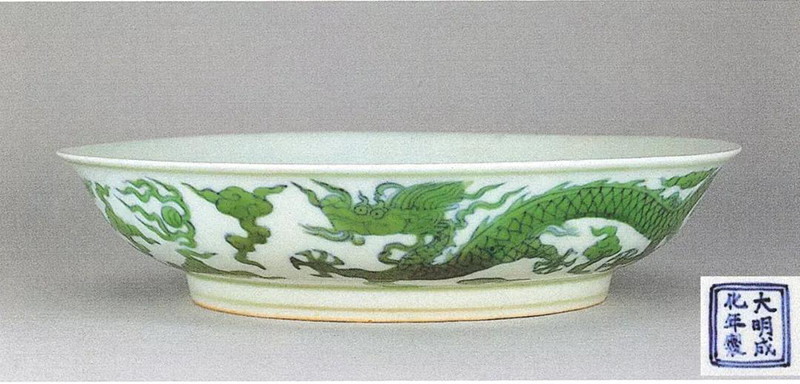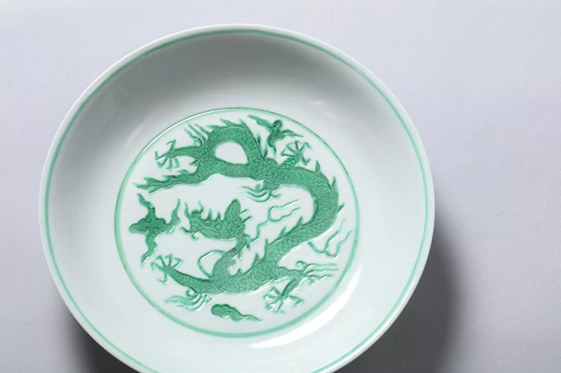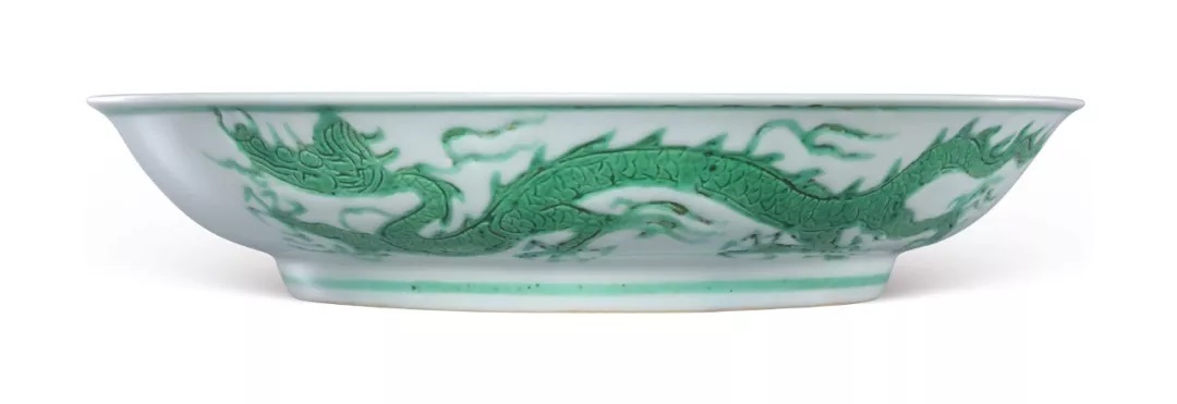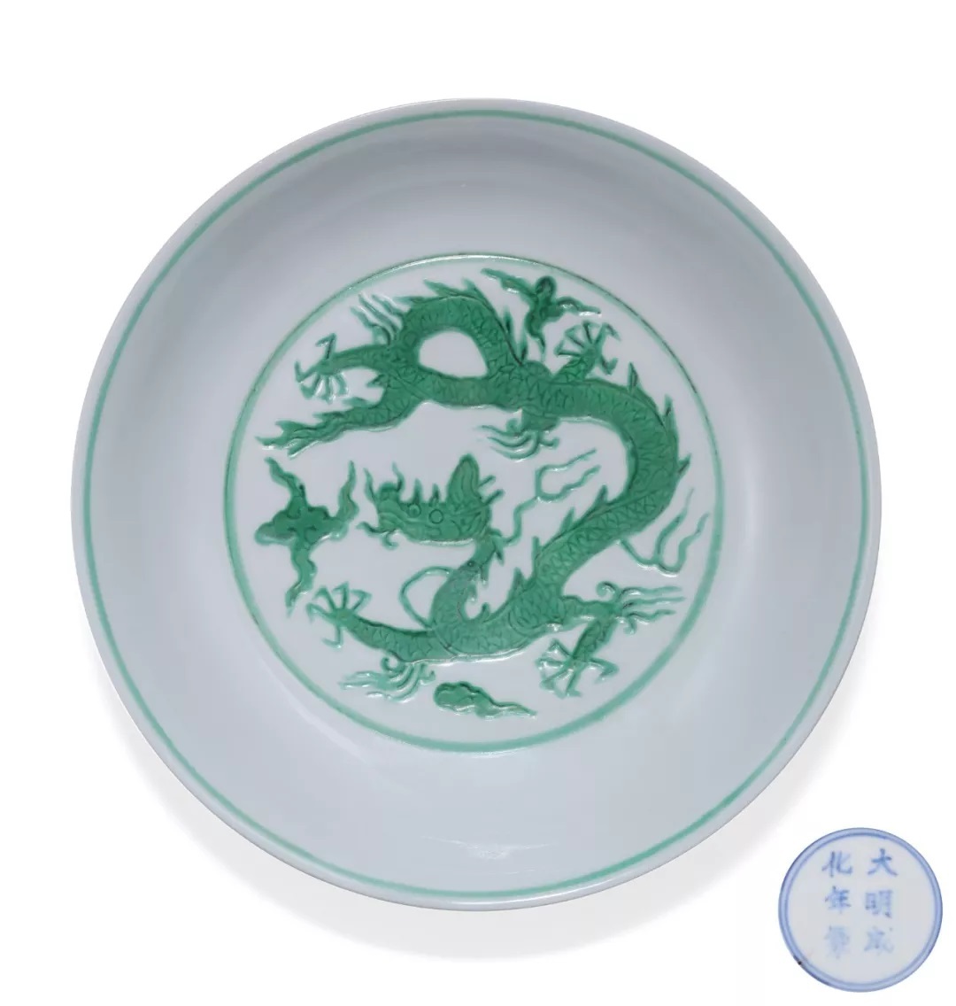 白釉绿彩龙纹器为成化朝创烧品种,而暗刻纹饰者,为其中工艺最为复杂品类。成化时期,皇家对官窑瓷器的烧造与管理均十分严苛,尤其饰有龙纹的御窑瓷器更甚,仅限于宫廷使用,严禁外流和私藏。《明宪宗实录》载:“掌太医院事左通政方贤谪戍辽东。先是西厂未罢时,太监汪直恶贤,遣人就其家搜检得片脑、沉香等药,并以为盗之官库者,且家藏御墨并龙凤瓷器,俱属违法,故得罪。御医史斌以附贤,亦发为民。”可见成化御窑森严的等级制度,代表皇家至高无上的威仪,尊崇而不可冒犯。