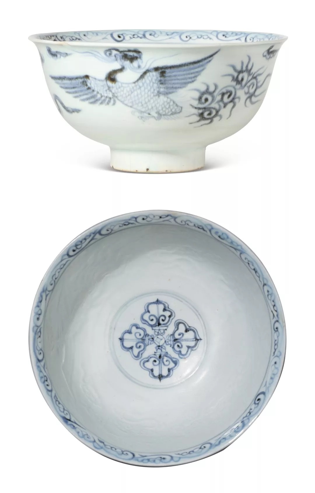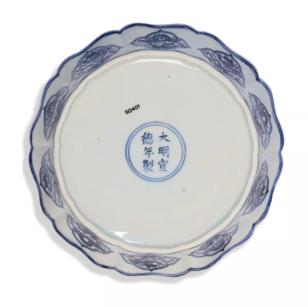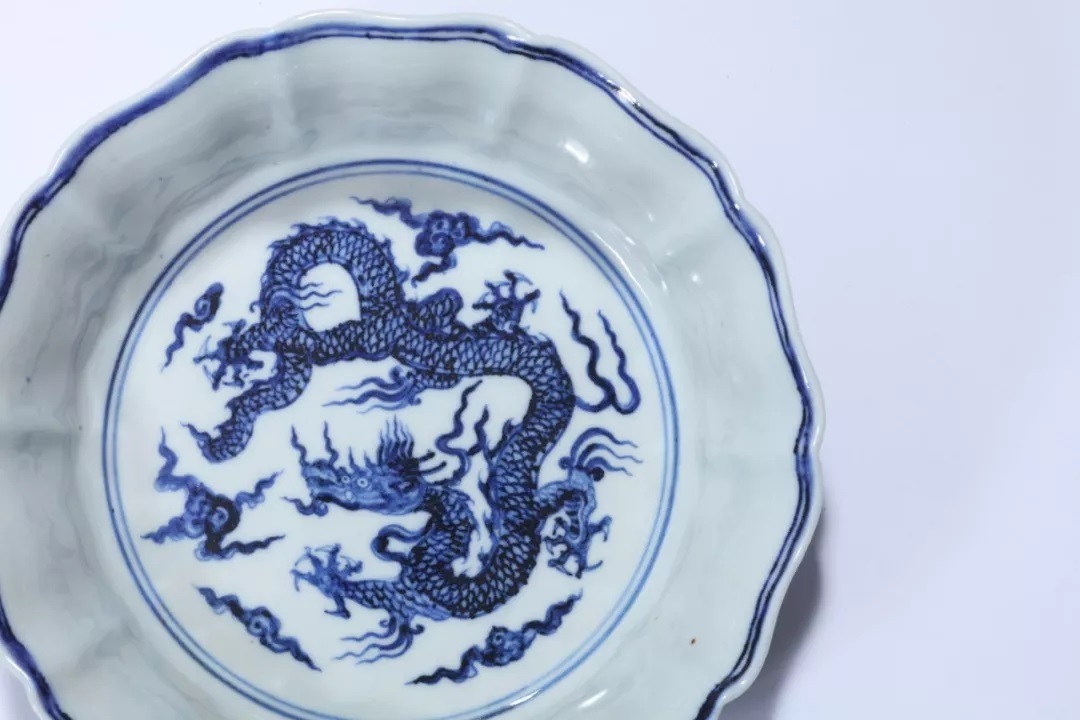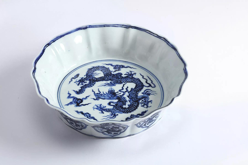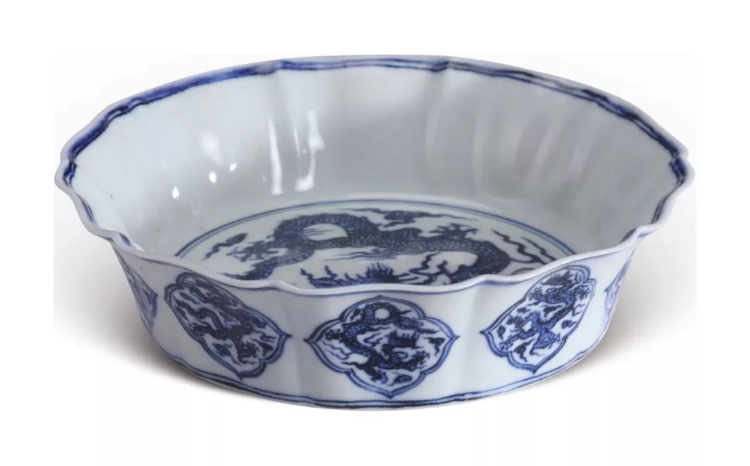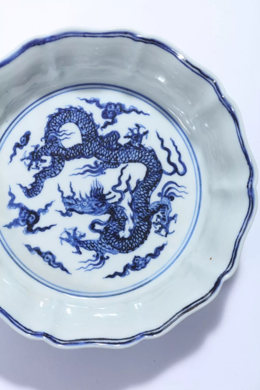 本品造型精巧别致,端庄秀雅,呈葵瓣花口十棱式,浅壁,器口起伏有致,至底微敛,底心微凸,尽显曲线变化之佳妙。考其形制当为印模而成,凡印器入窑遇火容易疵裂变形,完好者百中不得一二。若如本品此般纤薄,却毫无变形之不足,殊为珍稀。其胎体细腻洁白,釉质莹润亮青,青花自然晕散,为明代宣德时期的青花标准器之一。内底心青花双圈内绘一五爪降龙穿梭于祥云之间,龙首威武昂扬,须发长而向上飘起,龙身舒展修长,雄姿遒劲,矫健勇猛,气夺千里,灵动活现中不乏威严。外壁十组菱花形开光,每一开光内均绘有一团龙,升龙与降龙相间,游龙矫健飞跃,威势凌人,规整中富于变化,整体组合主次统一,相得益彰。纹饰采用小笔渲染填色,笔触细腻,精巧有神,淡描勾线与渲染相结合,勾画婉转流畅,画法布局既灵活多变又有较强的规律性,使得龙纹造型层次丰富,精细典雅,凸显宫廷龙纹的震慑之感,可谓旷世隽品,极负盛名。