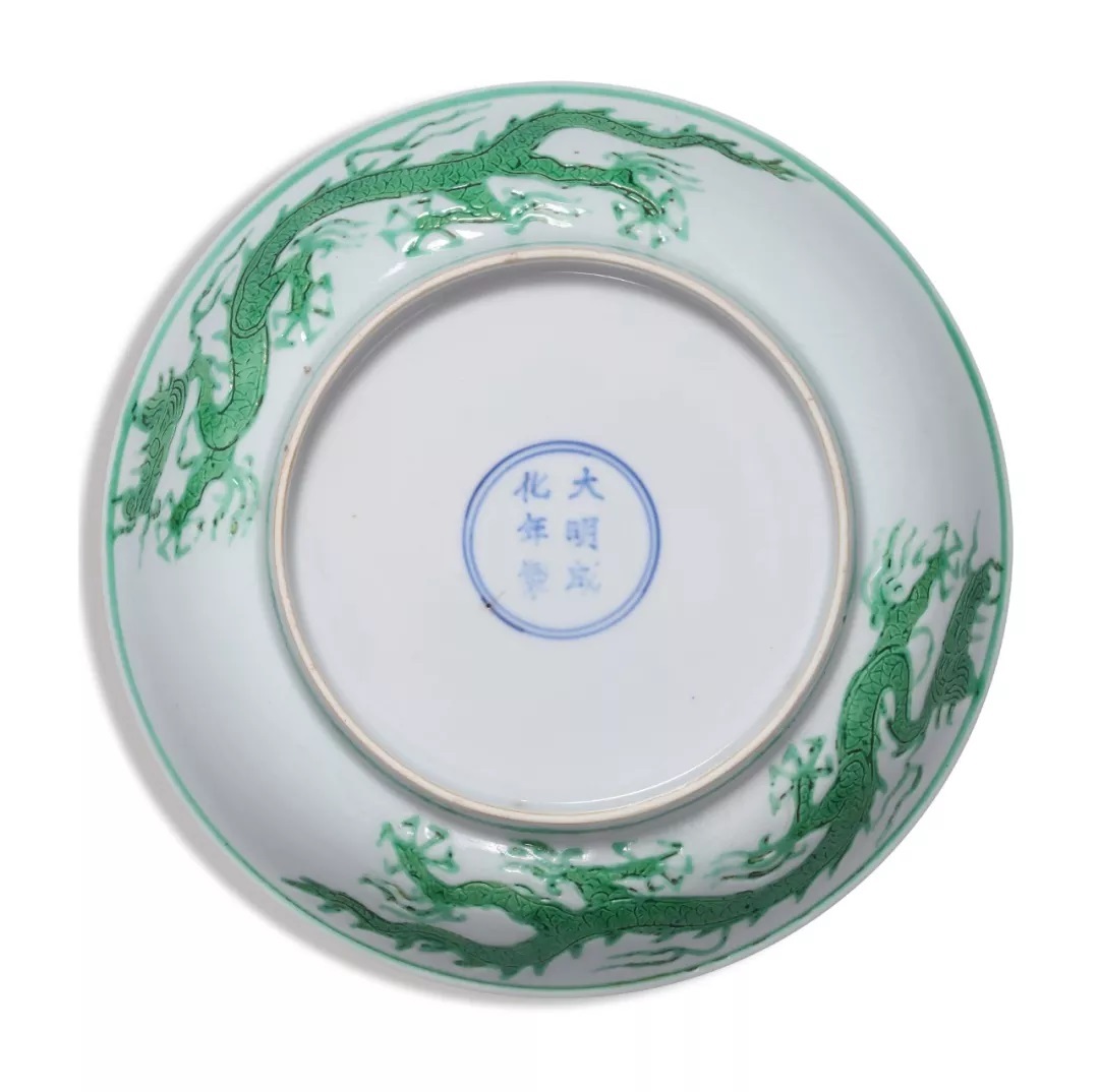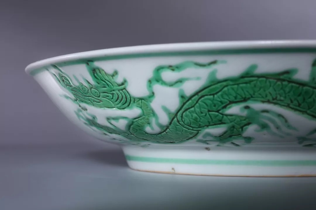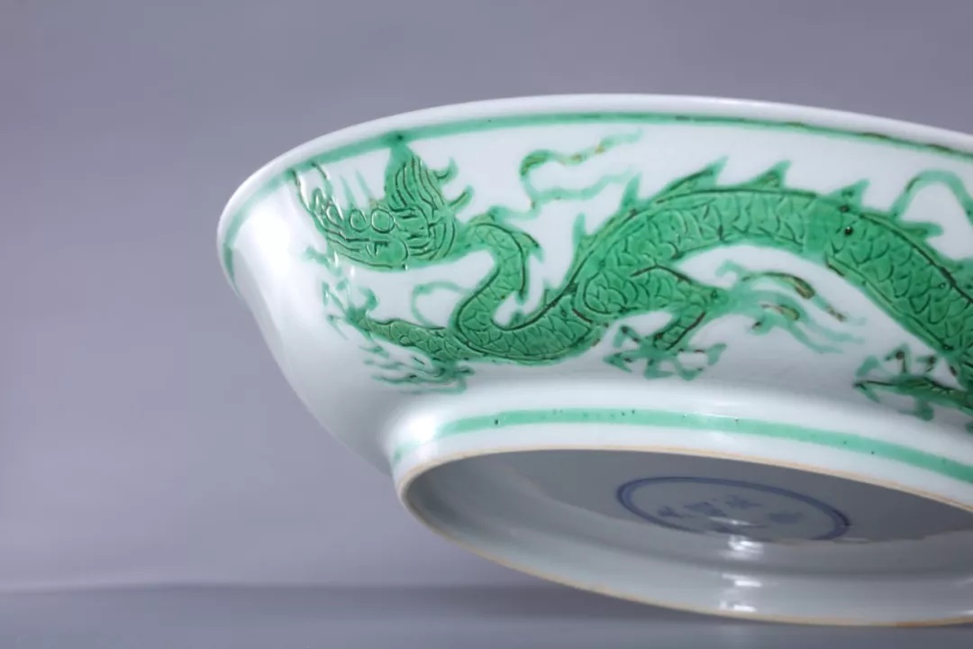 盘敞口,弧壁,浅腹,圈足。罩施白釉为地,内底心及外腹部均于胎上刻划云龙纹,间以火珠、“壬”字云纹,龙身盘曲遒劲。花纹处涩胎不施白釉,高温烧成后于纹饰处填绘绿彩,再入窑低温烘烧。外壁釉下暗刻海水波涛纹,两条绿彩龙纹装饰其间,盘底青花双圈内楷书“大明成化年制”款。