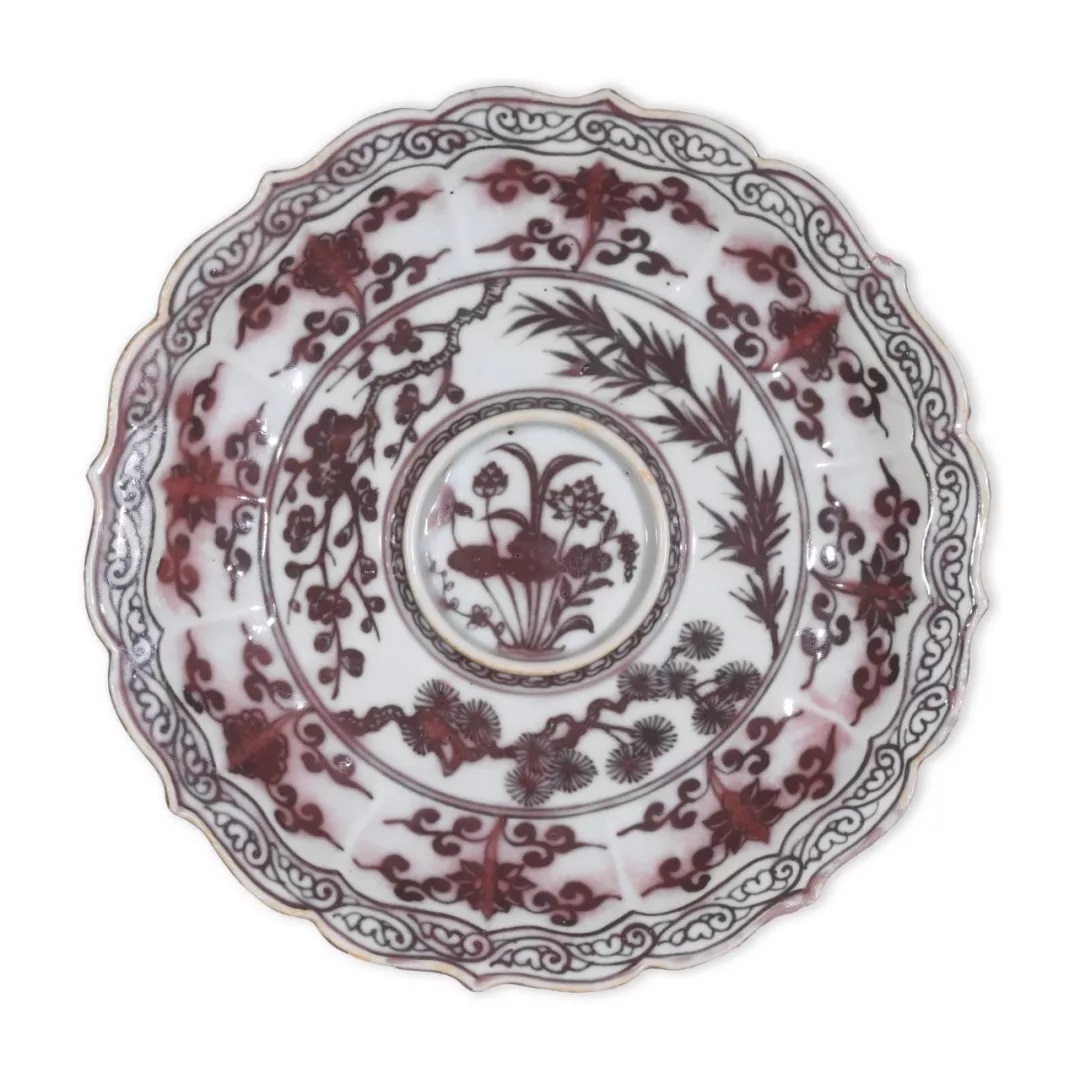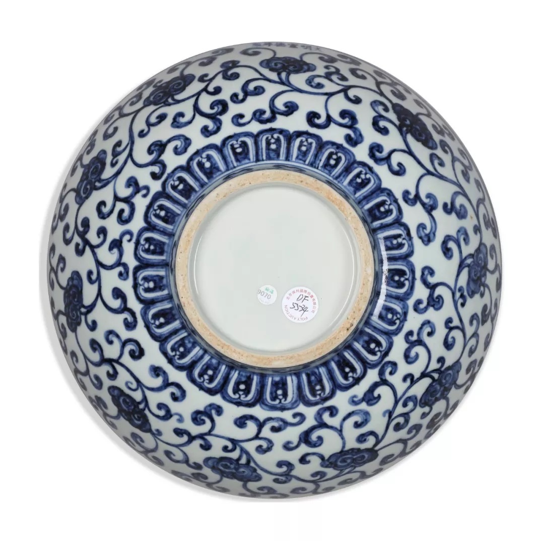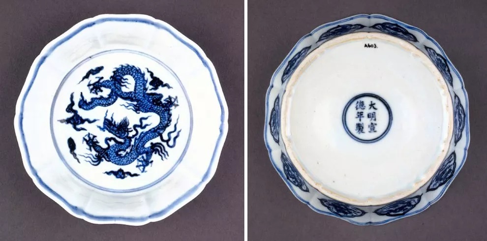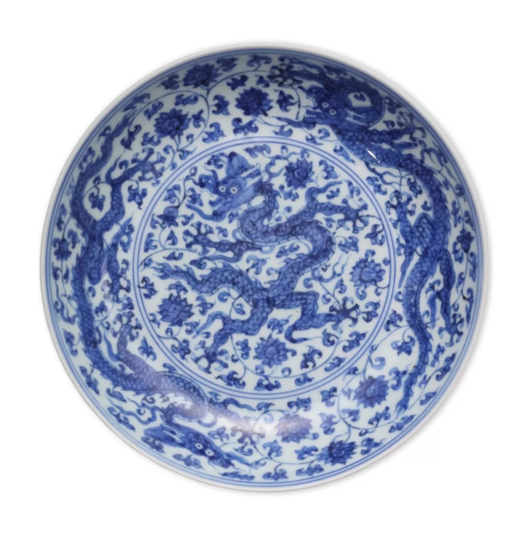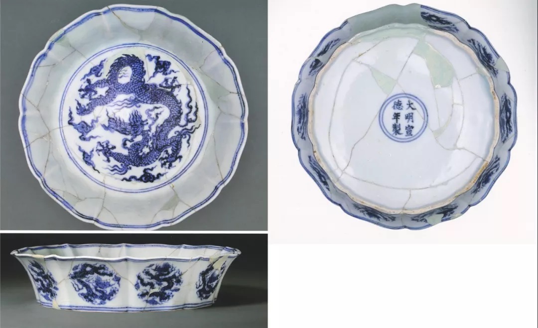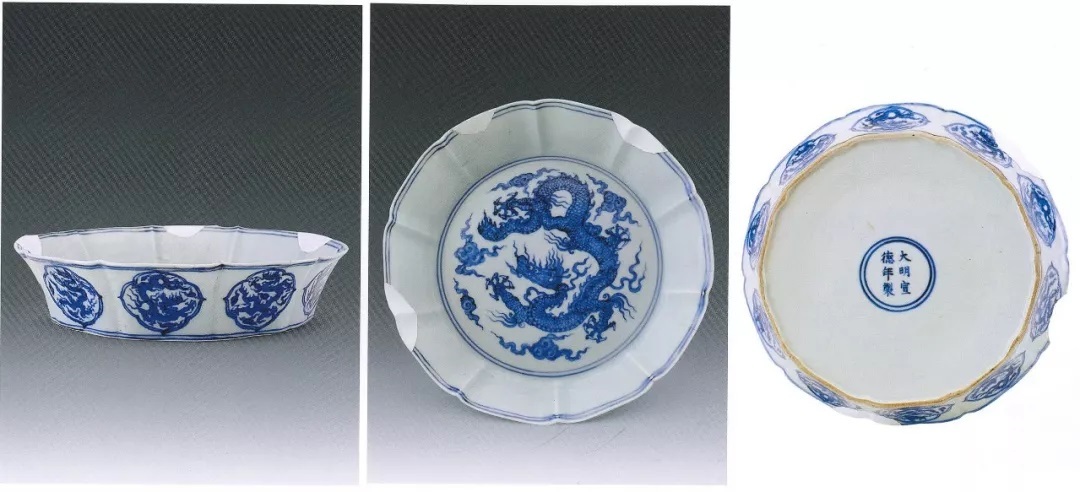 宣德时期承继了这一制式,惟足内不再绘五爪飞龙,代之以宣德六字款。景德镇出土复原器,见《景德镇出土明宣德官窑瓷器》,鸿禧美术馆,台北,1998年,图录编号19-1。台北故宫藏有数件,直径可分为15.7-15.8厘米、18厘米及20厘米左右三类。1962年出版的《故宫瓷器录 第二辑 明(甲)》(下编)著录其中两件,口沿皆有金属扣。苏富比香港1992年10月27日上拍一例,编号35(直径18.5厘米)。另有一件上拍于瀚海拍卖,1996年6月30日,编号990,尺寸较大,直径达21厘米,虽口冲有崩,仍以110万元高价成交,后依次上拍于佳士得香港,2008年5月27日,拍品编号1569,及保利北京,2010年12月5日,编号4553,成交价2688万。