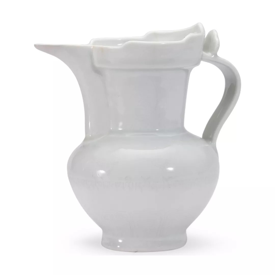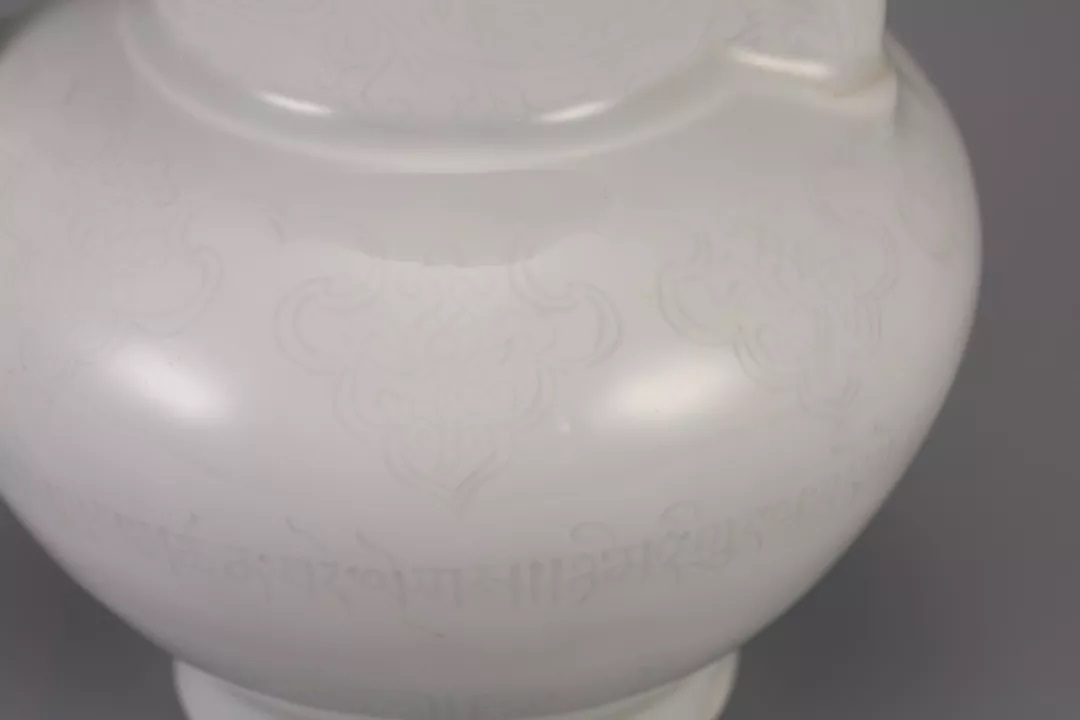 明永乐 甜白釉暗刻藏文吉祥颂缠枝莲花僧帽壶