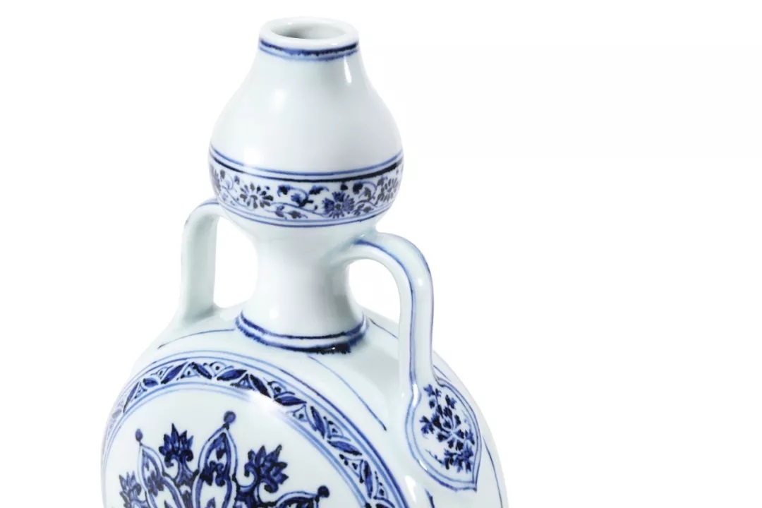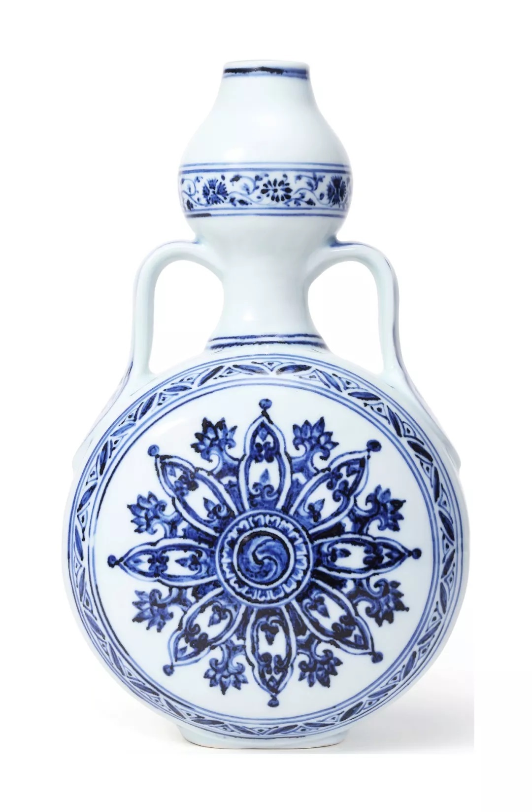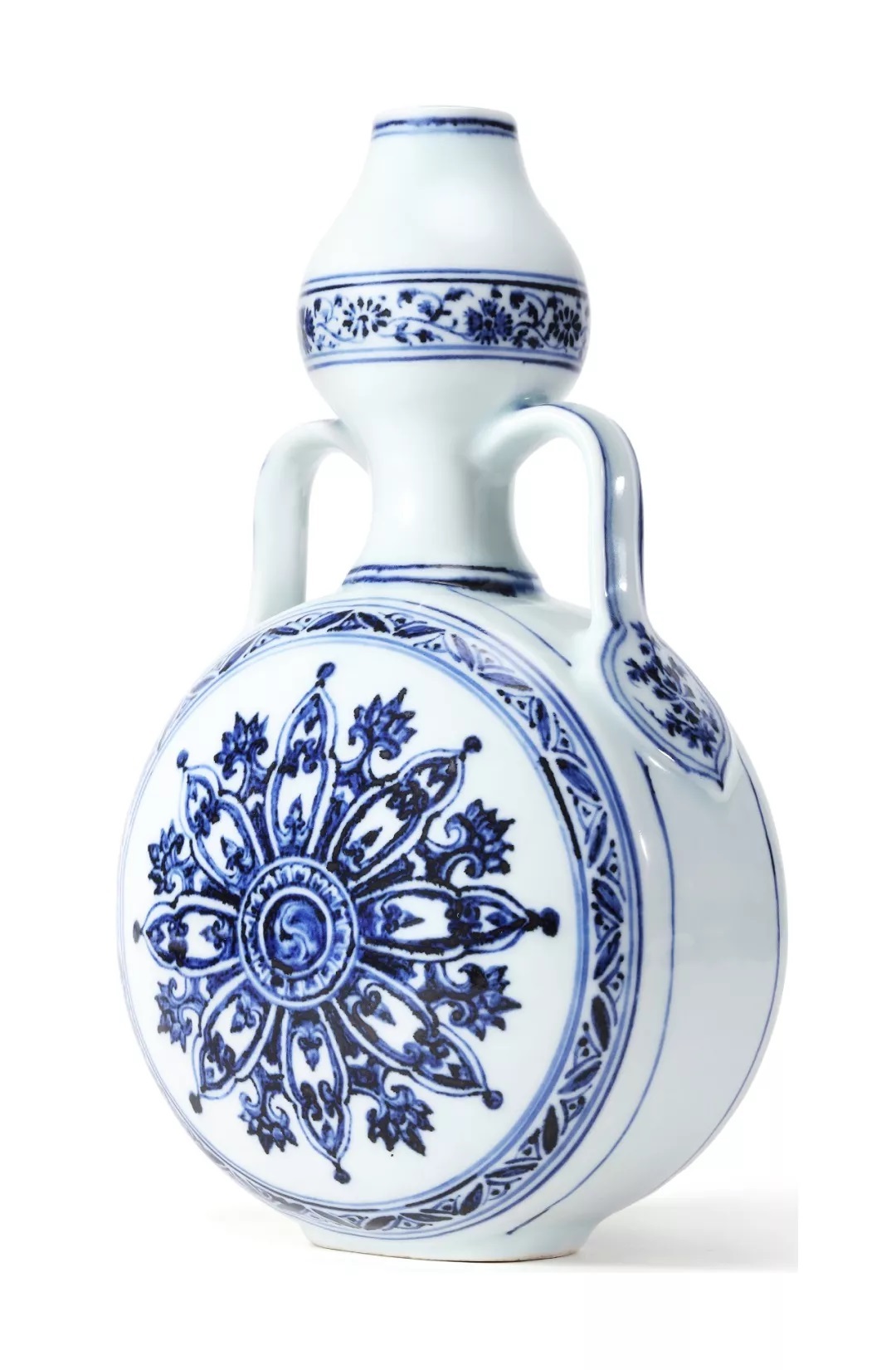 本品属明初景德镇御窑经典造型之一,呈葫芦形,上半部敛口鼓腹,中部束腰,下腹部呈扁圆形。承矮圈足。颈肩两侧置对称绶带耳。通体罩施白釉,釉汁莹润肥腴,其上以青花为饰,纹饰皆以双弦线分隔,上部饰环带状缠枝花卉纹,双耳饰缠枝番莲纹,下腹部双面对饰宝相轮花纹,外环钱纹。所绘青花发色苍妍,微有晕散,浓重处泛蓝黑色,铁锈斑色泽沉郁,沁入胎骨。构图疏朗雅致,纹样写实传神,画功娴熟,勾、勒、点、染诸法,运用皆宜,笔触浓淡不一,晕散自然,从而使画面富具苍翠欲滴的意趣,透出隽永雅丽之美。