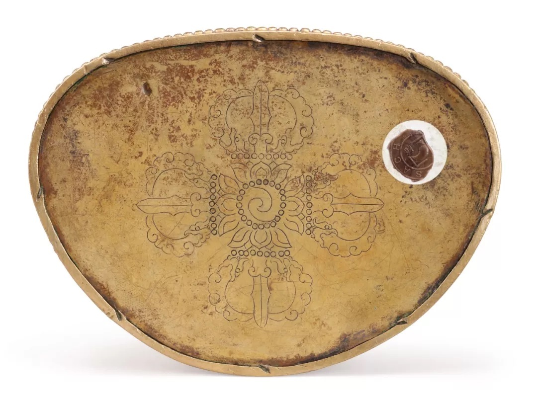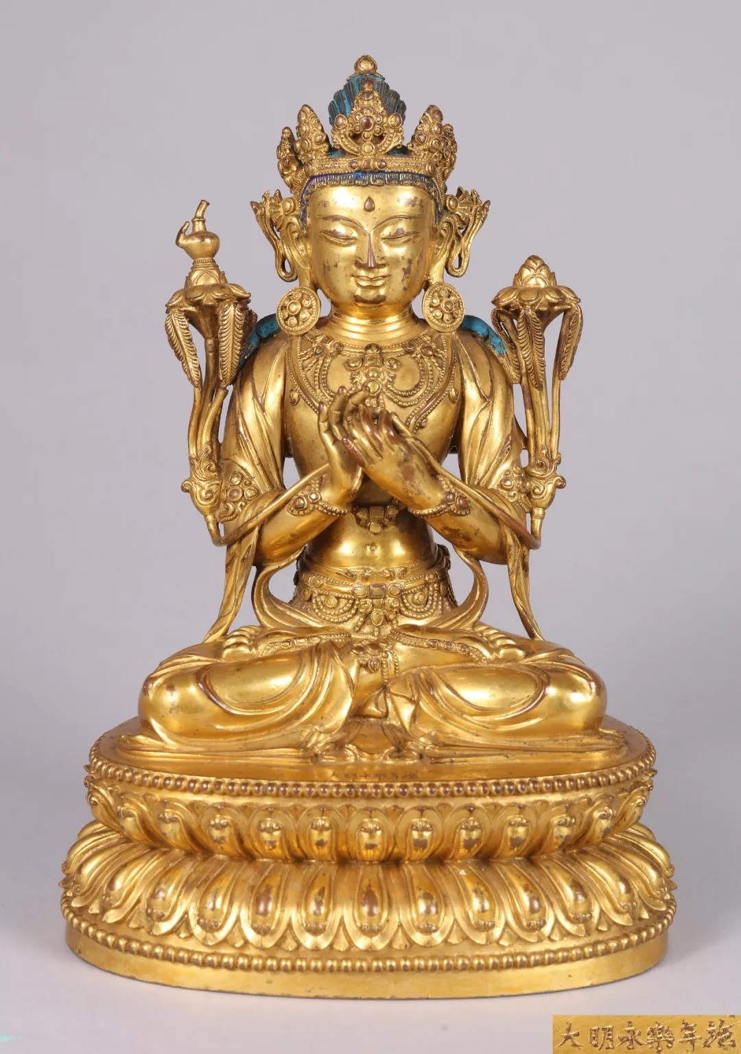 此像头戴花冠,头顶结高发髻,耳侧缯带呈U字形翻卷,耳下垂圆环。面形方正,面容庄严肃穆。双肩宽厚,腰部收束,躯体柔软,肌肉饱满有力。特别是它的身体略向右倾,显现出躯体的阿娜和体态的动感。上身饰项圈和长链,项圈下缀U字形连珠式璎珞,下身着长裙,腰间束宝带,腰带下亦有U字形连珠式璎珞装饰,双肩披大帔帛,手和足部有钏躅装饰。裙子与帔帛采取写实手法表现,衣纹流畅优美,生动表现出丝织物本有的质感。结跏端坐于双层束腰式莲花宝座上,四手各持象征其功德与智慧的法器。其中,一双右手持剑,横断上空,象征智慧之剑斩断一切执着和缠缚,左手于胸前拈一支乌巴拉花茎部,延伸到左耳边的花朵上置般若经箧,象征所有智慧来自般若经典;另一双左右手分持箭和弓,象征能除去无明愚痴。莲花座造型规范,上下边缘各饰一周圆形的连珠纹;莲花瓣周匝环绕,饱满有力,头部饰有立体感较强的卷草纹;座面阴刻“大明永乐年施”六字款,文字细劲,书体柔美,为永乐宫廷造像中最为标准的款识。莲座下有完好的装藏,使其继续保有神秘的宗教灵性与加持法力。封盖中央部位刻有十字金刚杵,金刚杵中心刻阴阳鱼图案,封盖的边缘均匀分布有固定底盖的八个剁口,底盖及周边残留有朱砂和封蜡,这些都显示了装藏的完好无损。