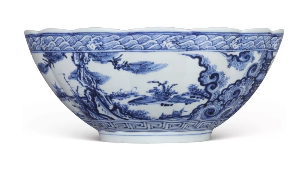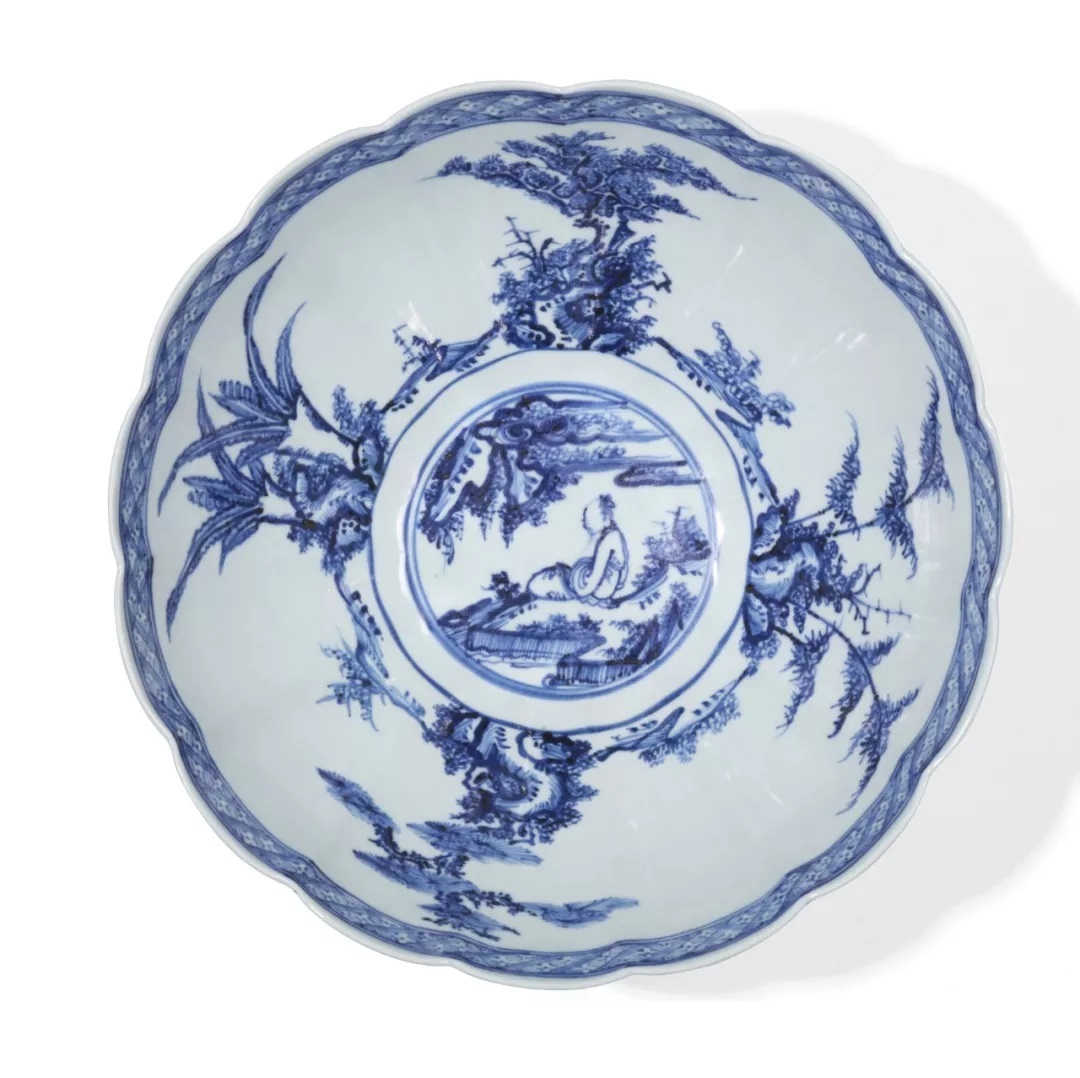 明正统-景泰 青花宫苑楼阁高仕图葵口大碗