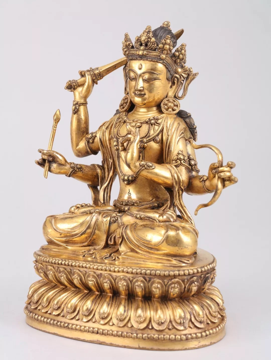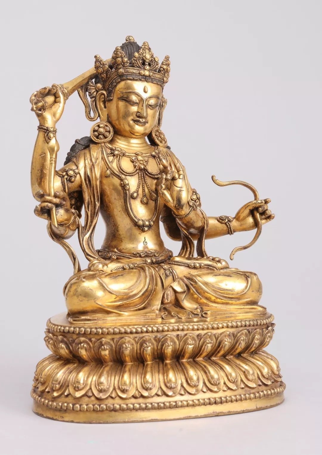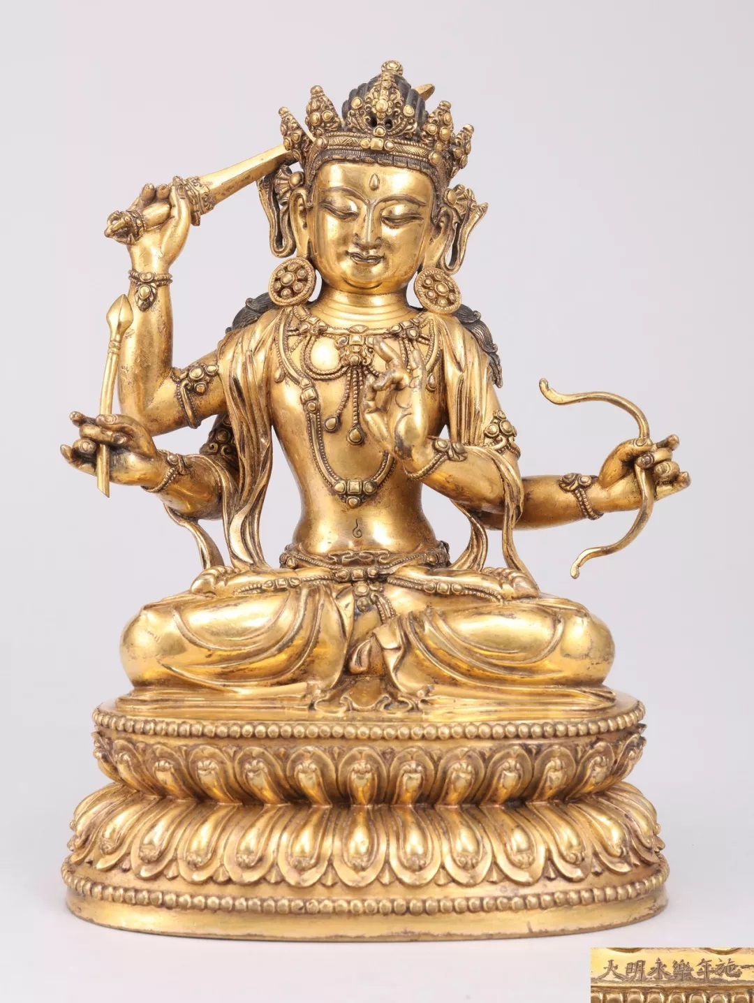 近些年,虽然我们欣喜地看到佛像艺术品市场已趋向成熟,不再是明代宫廷佛像一统天下的尴尬局面,一些艺术性、工艺性较强和题材独特的佛教造像纷纷脱颖而出,受到市场的追捧。然而,尽管如此,明代宫廷造像的价值和地位已经牢固树立,不可撼动。试想,如果艺术品市场上没有明代宫廷造像,如果佛像专项收藏中缺少明代宫廷造像,那将是一个多么大的缺憾!因此,今后的佛像艺术品市场上,明代宫廷造像仍将作为佛像中的尤物受到佛像艺术品爱好和收藏者的特别关注,继续发挥其重要引领作用。现在我们欣赏的这尊明永乐款铜镀金四臂文殊菩萨像,就是一尊风格典型的明代宫廷造像,由这尊造像我们不但可以欣赏到明代宫廷造像独特的艺术风采,更可以领略到明代宫廷造像在佛教造像艺术中的特殊地位和价值。