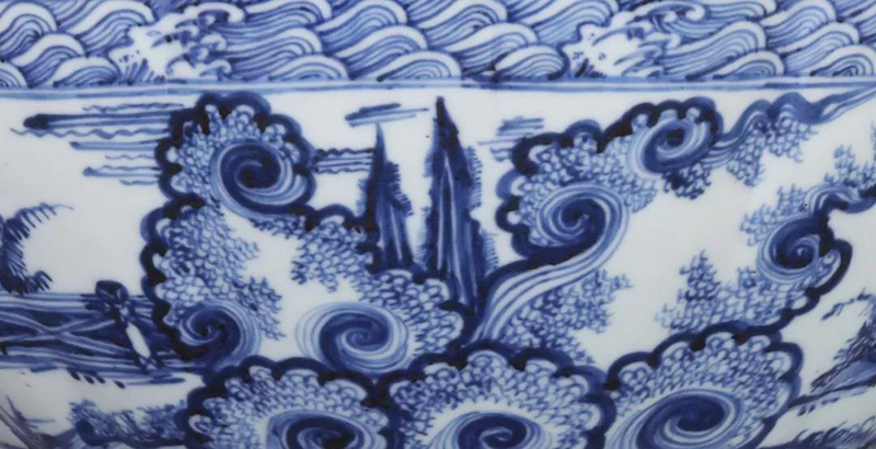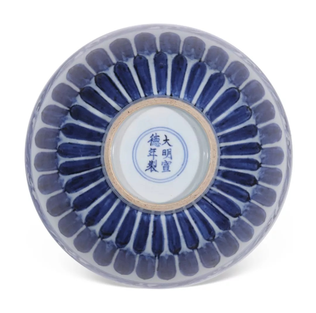 宣德御窑瓷器,尤以青花“开一代未有之奇”,以古朴典雅的造型、晶莹润泽的釉色、丰富多样的纹饰而闻名于世。青花器发色庄重舒雅,色调深沉雅静,自然天成,幽菁瑰丽,为明代青花瓷器之冠。明王士性《广志绎》中载:“本朝,以宣(宣德)、成(成化)二窑为佳,宣窑以青花胜,成窑以五彩。”明张应文《清秘藏》对宣德时期的青花瓷器也赞誉有加:“我朝宣庙窑器,质料细厚,隐隐橘皮纹起,冰裂鳝血纹者,几与官、汝窑敌。即暗花者,红花者,青花者,皆发古未有,为一代绝品。”清人朱琰《陶说》更直言:“故论青花,以宣窑为最。”