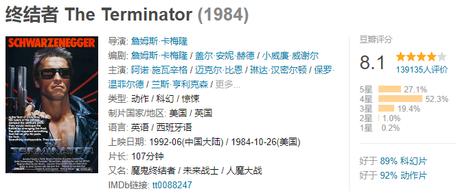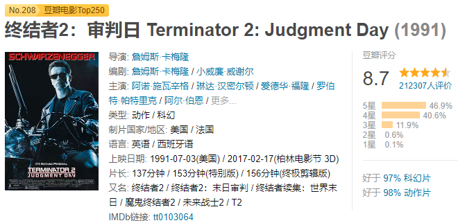 但《终结者:审判日》做到了。前作豆瓣8.1,《审判日》却高过前作0.6分,达到了8.7分。
