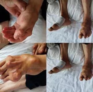 痛风石不仅影响外观,更要命的是还会源源不断地向外周循环释放尿酸盐,导致血尿酸控制越发困难。尿酸盐在关节内沉积增多,炎症反复发作进入慢性阶段而不能完全消失,会引起关节骨质侵蚀缺损及周围组织纤维化,使关节发生僵硬畸形,活动受限,随着炎症的反复发作,使病情越来越加重,严重影响关节功能。