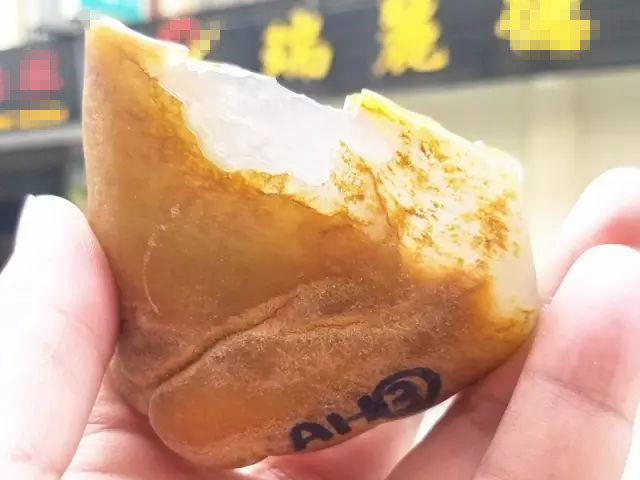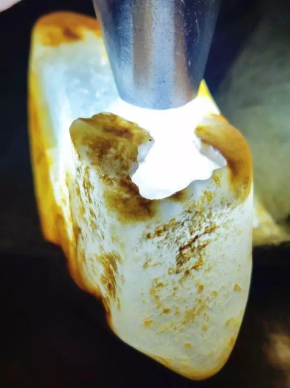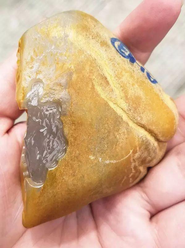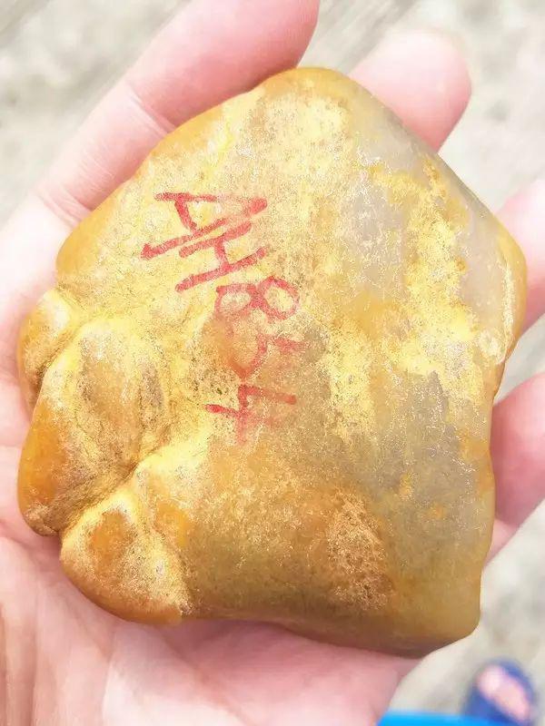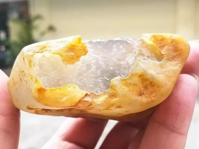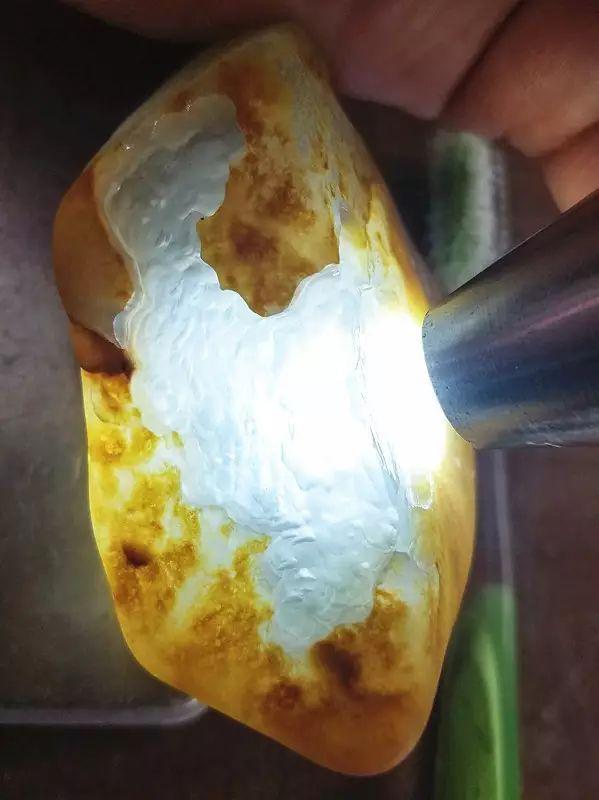 一块来自大马坎厂口的原石,说起大马坎的石头,真的一点都不大,产出的原石都芒果大小,不会有大块头。往往皮壳压灯会呈现黄色,但是究竟是不是黄肉让人挠头。