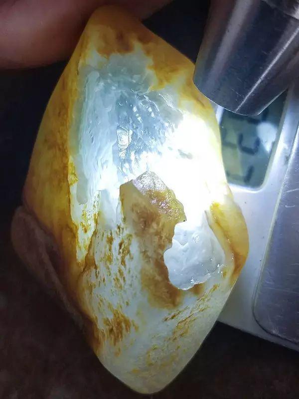 大面积的脱纱皮壳已经给出了答案,这块白肉打底的原石已经是冰味十足了。