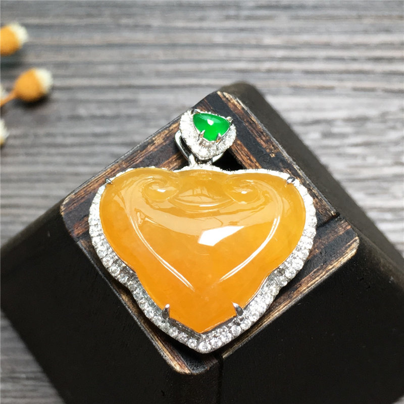 开篇的图也是黄翡,它的翡就更红一些,但是我们细看的话,就会发现牌子的翡色越往牌子的背面就越淡了,变成了更淡的黄色。这就是很明显的以翡色调为主的黄,也可以说是带黄色的翡。
