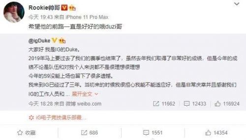随着IG在世界赛比赛的结束,各个成员间的合同也即将到期,目前各大选手都已经开始了各自的转会工作,目前IG中NING和阿水似乎都已经预备转会,但是就在外界众说纷纭之时,一个意想不到的人率先说出了离队的消息。Duke这位在IG中最年长的大哥发表微博,宣布将离开一起度过三年时光的IG。