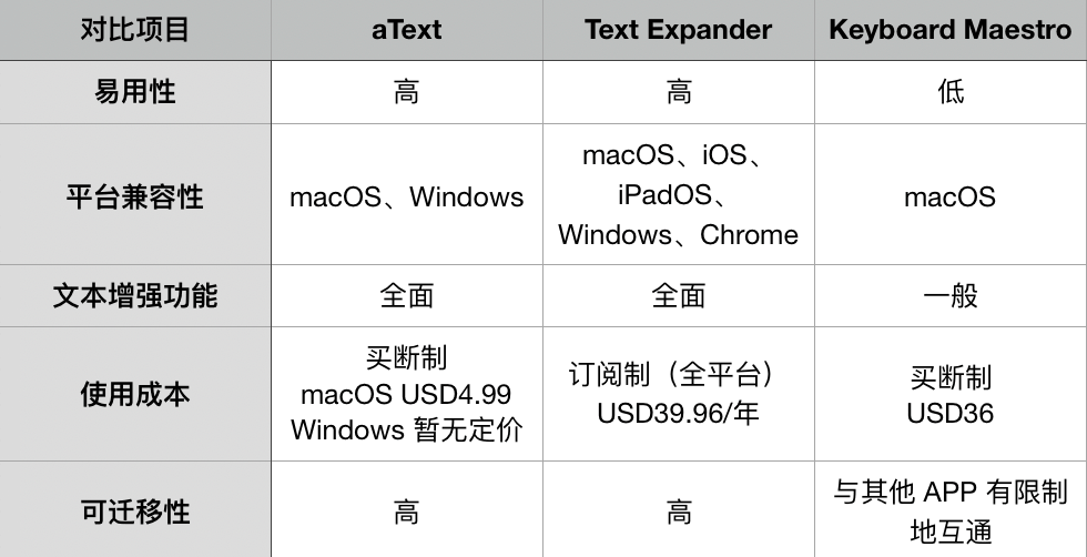 aText 自从推出 Windows 版之后,可用性已大大提高,化解了 Windows 平台中文本输入效率软件只有 TextExpander 可选的尴尬。在这里把典型的几款具备同类功能的 App 进行简单对比如下图所示: