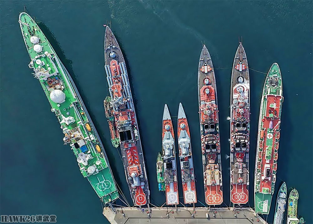 这张照片中出现的几乎是俄罗斯海军太平洋舰队中所有能够执行作战任务的军用舰船,从左至右分别为:“克雷洛夫元帅”电子侦察舰,“光荣”级巡洋舰“瓦良格”号,20380轻型护卫舰“完美”号和“喧闹”号,“无畏”级大型反潜舰“萨波什尼科夫元帅”号和“崔布兹上将”号,“额尔齐斯河”号医院船。除了最小的两艘20380轻型护卫舰以外,都是苏联时代制造的军舰,昔日苏联红旗太平洋舰队已经沦落到如此境地。