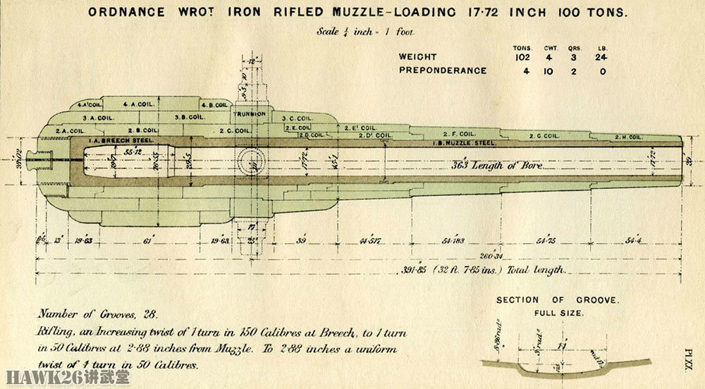 最后放一张100多年前超重型岸防炮的身管设计图。这是英国阿姆斯特朗兵工厂1877型450mm(17.72英寸)岸防炮的身管剖面图,该炮重达100吨,是19世纪最重型的火炮。它发射的910千克弹丸可以在1829米的距离上,击穿半米厚的船体。这种重炮部署在马耳他和直布罗陀,从未在战斗中使用过。从这张设计图可以看到身管制造工艺非常复杂。