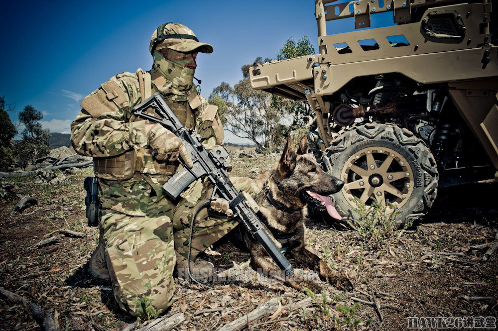 澳大利亚联邦警察(AFP)直辖的特警队“专家反应小组(SRG,Specialist Response Group)”。这位特警使用一支AR-15步枪,配备OSS消音器,旁边还有警犬和一辆“北极星”轻型全地形车。