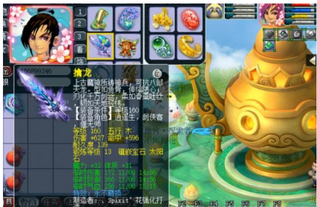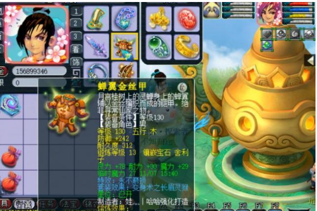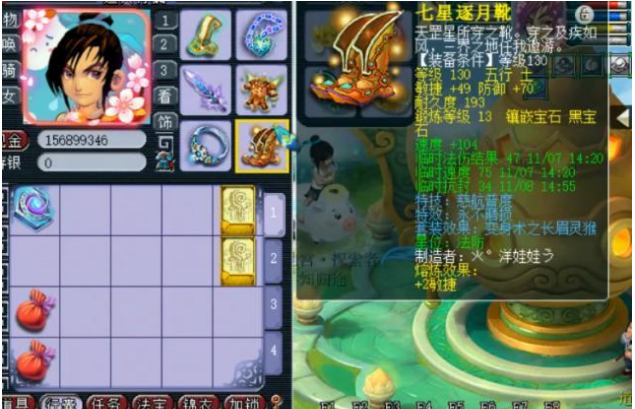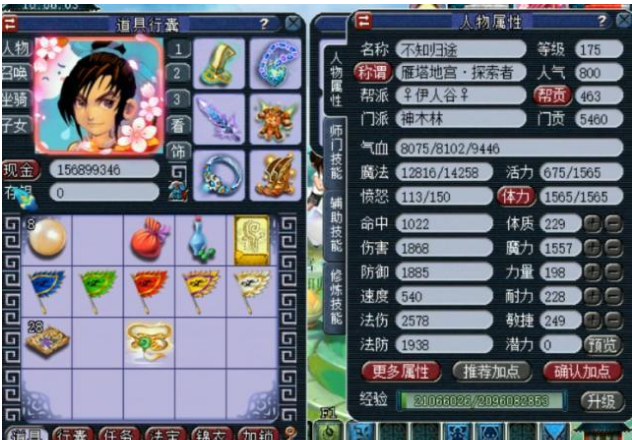 这个从69怒升175的是一位神木林玩家,满级带临时符的属性可以说是相当不错了!2578的法伤足以面对175的一切活动了!装备方面更是给力!130的不磨四海头盔!13段月亮石,长眉灵猴套装,四海在任务中属于一个常用的大特技了吧!
