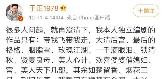 自我、执拗,好为人师的性格在很长时间里,给于正贴上了一个又一个负面标签,一度让他成为“作”的代表,但显然,于正并不那么的在乎。