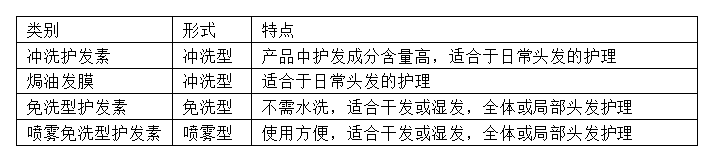冲洗护发素是最常用的日常护发产品,其特点是通过用水冲洗可将护发成分均匀地分布于全体头发上。而煸油发膜中的护发成分含量更高,因此护发效果最强。免洗护发素则具有可以在任何时候、任何场合都能使用的特点,不需要额外的冲洗步骤。另外,它既可用于全部头发,又可以有选择性地用于局部头发的护理。