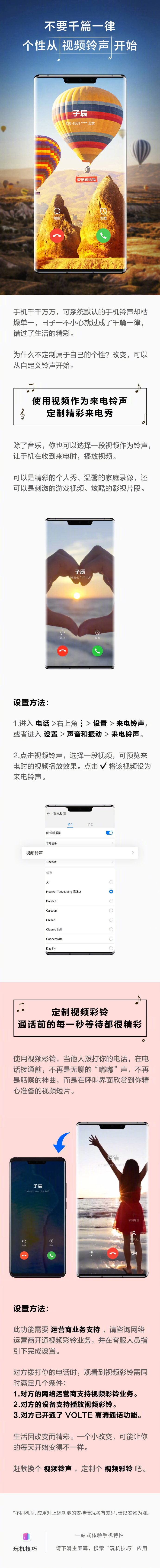 需要注意的是,这一功能需要运营商业务支持。他人拨打电话时,也需同时满足以下的条件才可观看视频彩铃,包括来电方的网络运营商支持视频彩铃业务、来电方的设备支持视频彩铃、来电方已开通了VoLTE高清通话功能。