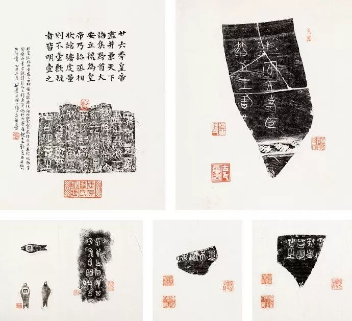 此为清晚期拓本,29张,纸本,尺寸不一。钤印:簠斋先秦文字、集秦斯之大观、秦诏量瓦之斋、抱景、武原陆氏所藏、燕庭收藏金石文字、两垒轩收藏金石文字、古瓦量斋、齐鲁三代陶器文字。