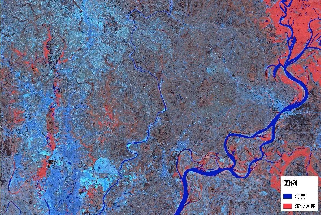 图(c)中蓝色部分为正常河流区域,红色是被洪水淹没的地区,主要为农田。