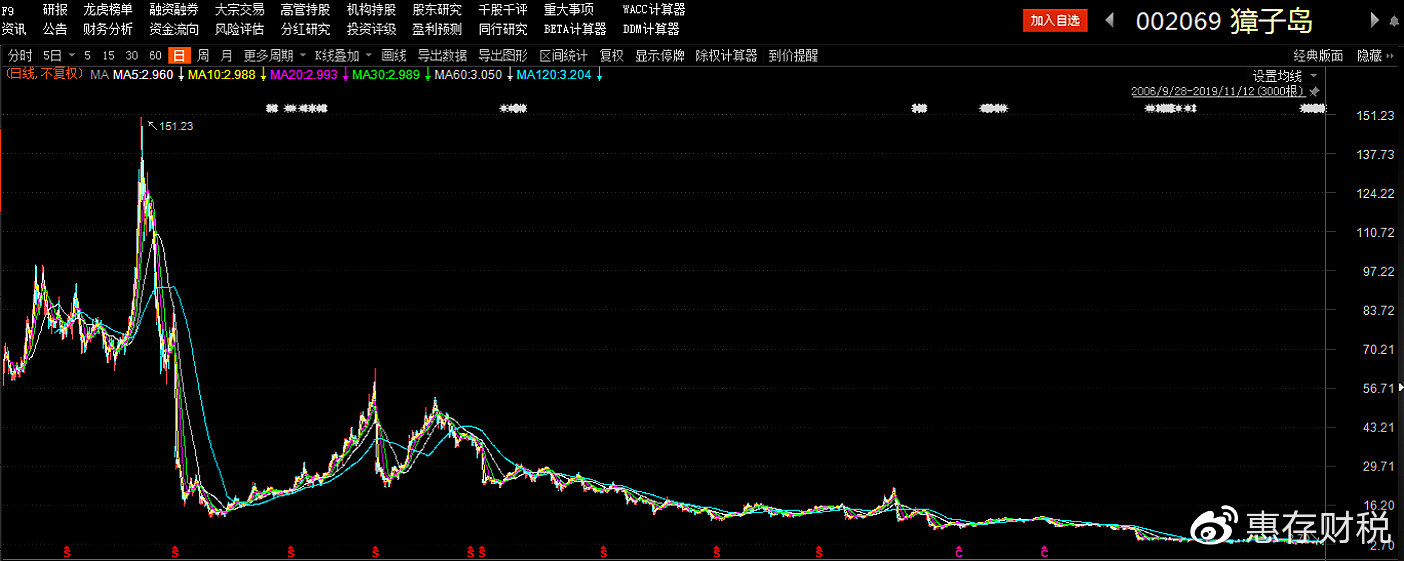 獐子岛曾经风光无限,在2007年成为了达沃斯“全球成长型公司社区”首批创始会员,并在2008年创出151.23元股价巅峰(不复权),创造了中国首个农业百元股。但是,登过高峰后,獐子岛股价进入下行通道。再加上几次扇贝事件,獐子岛股价一落千丈。今日是第三次扇贝事件发生后的首个交易日,獐子岛一字跌停,收2.70元。