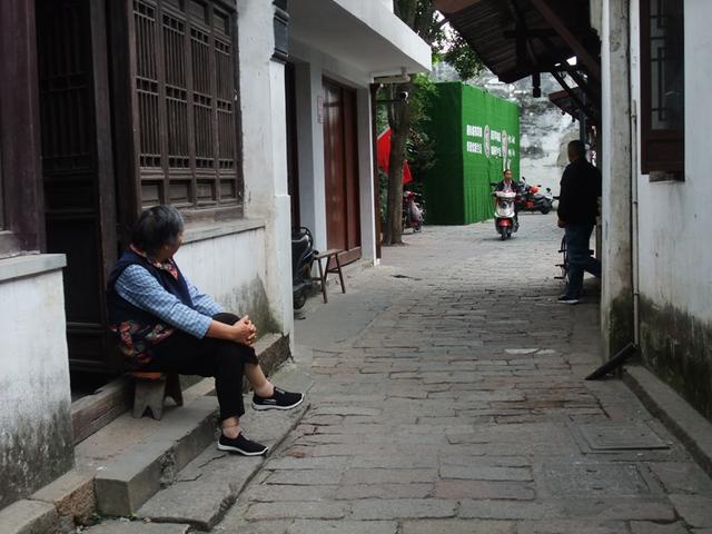 一位老人坐在自己门口,看着来来往往的过客。