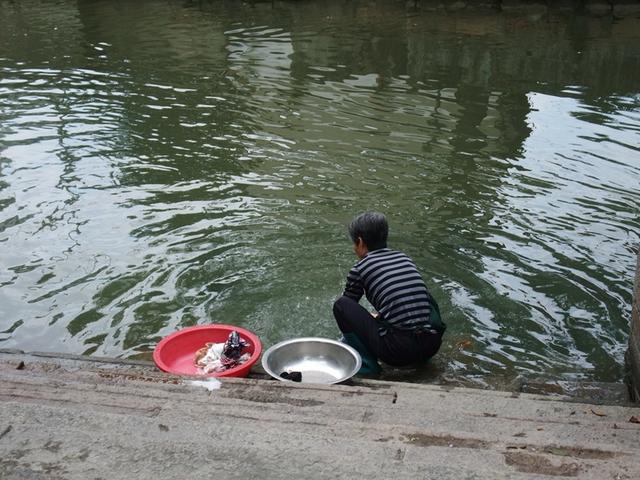 一位妇女在河边洗衣服。