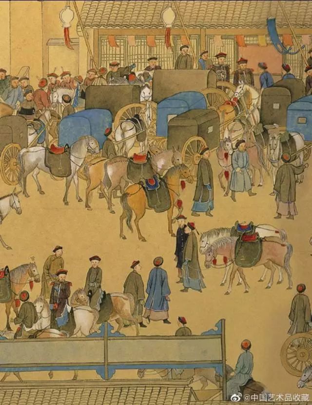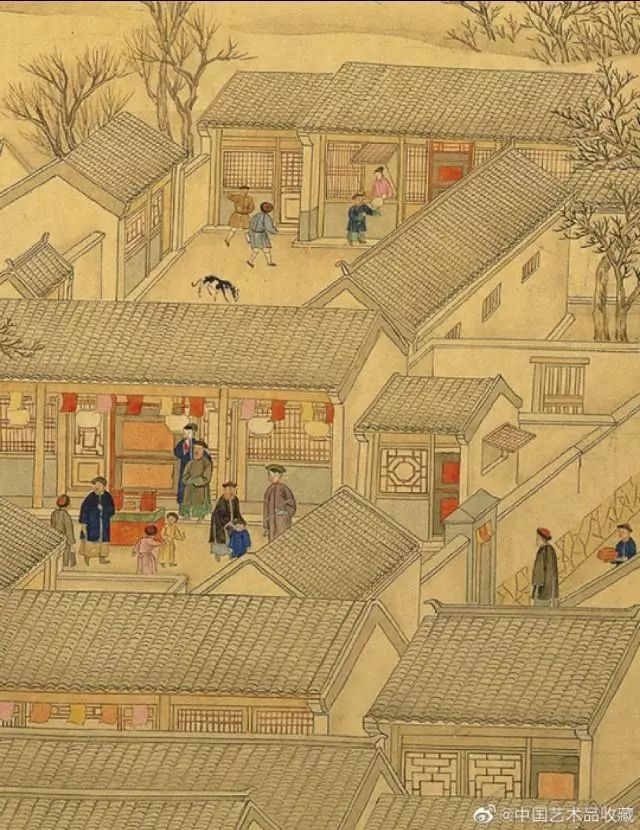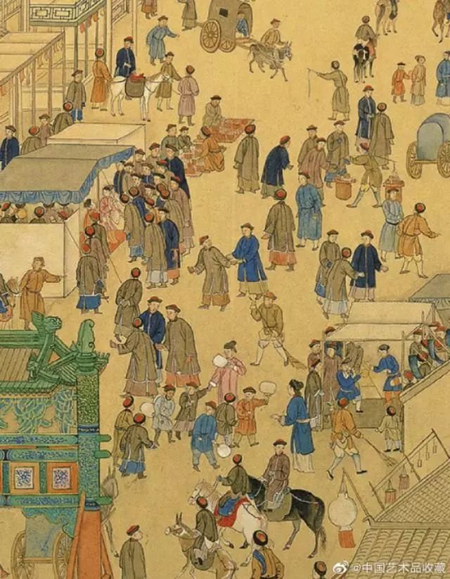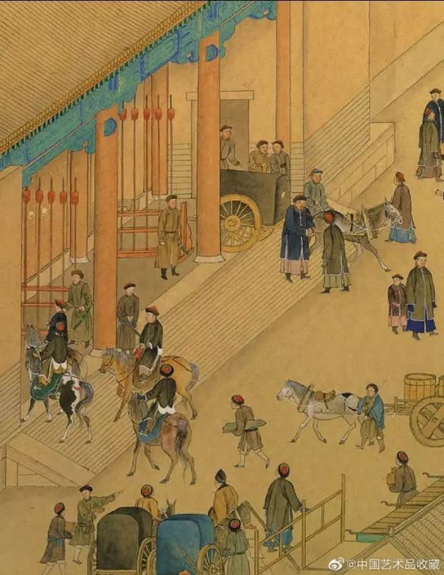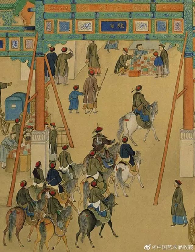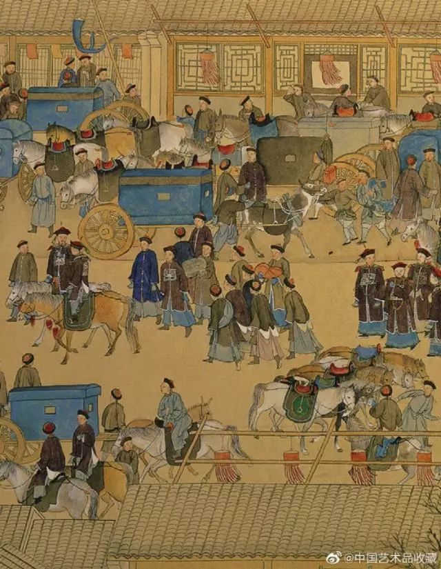 画卷中,文武官员进京朝贺,市井百姓也纷纷出门拜年,从故宫内城城墙、观象台起,经东单牌楼,到皇城内东安门、东华门止,北京东城区重要地标都浓缩在长卷中,画面描绘新春胡同巷道车马游人络绎不绝、街面店铺鳞次栉比,展现出乾隆盛世北京市井的繁华富庶景象。