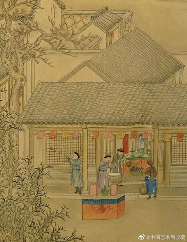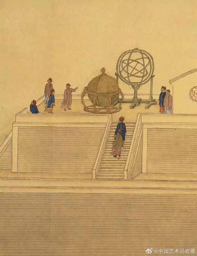 画卷前中段绘有观象台,上并有浑天仪、天体仪两座观测星象的仪器,观象台两侧天空各画日、月。卷中人物虽小,仍可见相互走告、观看天象之态,更因当日为元旦,贺岁拜年的姿态也穿插其中,写实历历。考文献纪录,当年正月五星位置确实相近,但未冠以“五星联珠”之称。或许正如款识所言,虽天象有兆,却未“ 宣付史馆”,而由徐扬此图扮演着与“文献”同功的纪实效能。