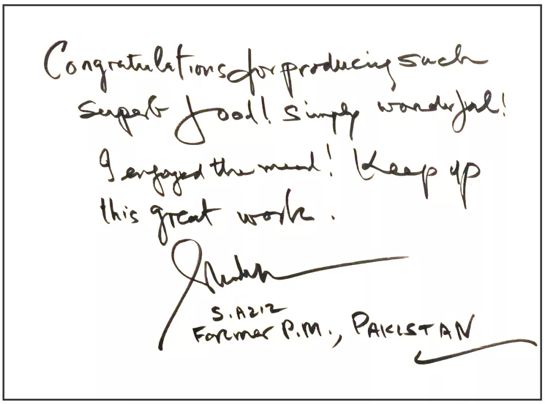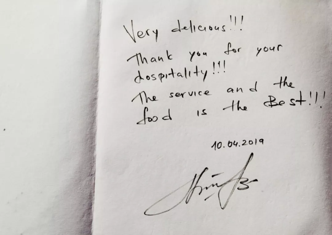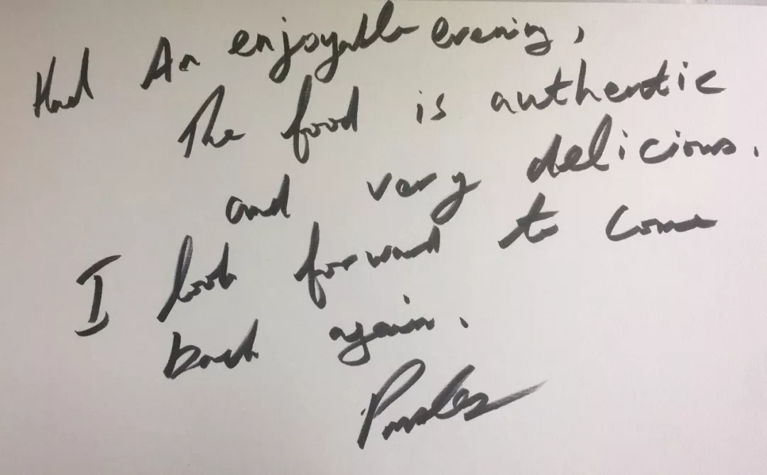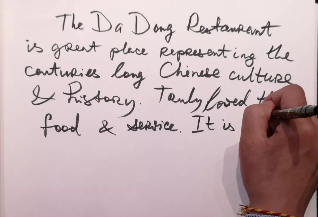 译文:“我对于此餐厅具有高专业性提供菜食附有独特和创新、充分注重养生和高质量的制作,并为我们提供高档礼仪,表示高度评价和感谢,同时祝愿公司生意更加昌盛,越来越好。”
