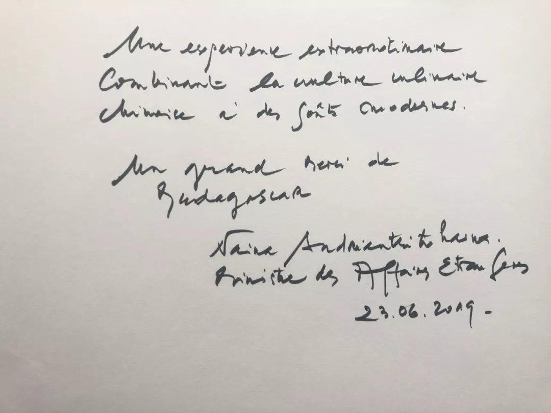 “今天晚上我用餐体验是最好的,还有中国的创新烹饪技术,谢谢你们的服务,我是来自马达加斯加的外长奈纳。”