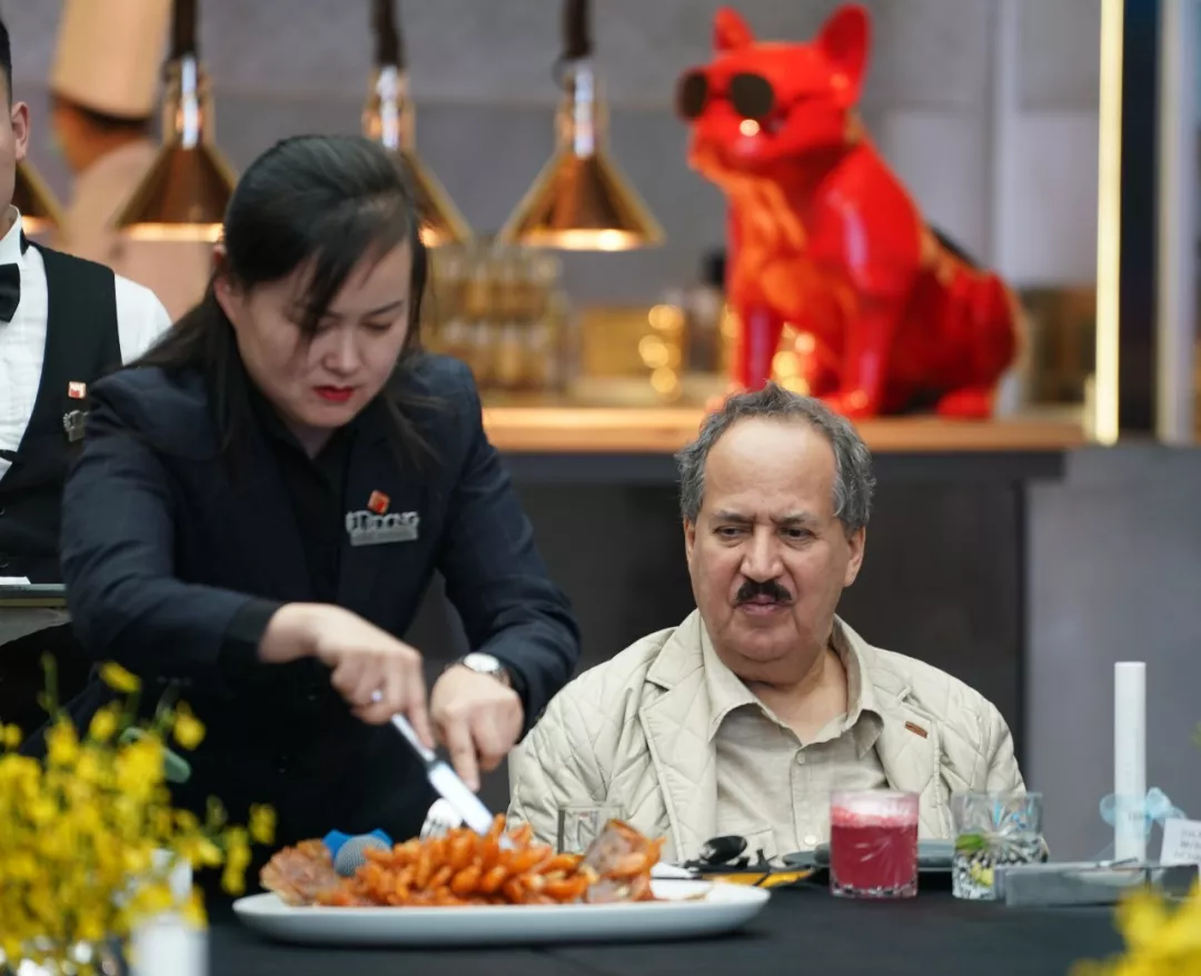 阿齐兹先生的最爱当然是我们的大董“酥不腻”烤鸭啦!,两家门店分别打卡,排队等位也要吃大董的烤鸭,酥香深深的吸引着这位来自巴基斯坦的低调贵宾……