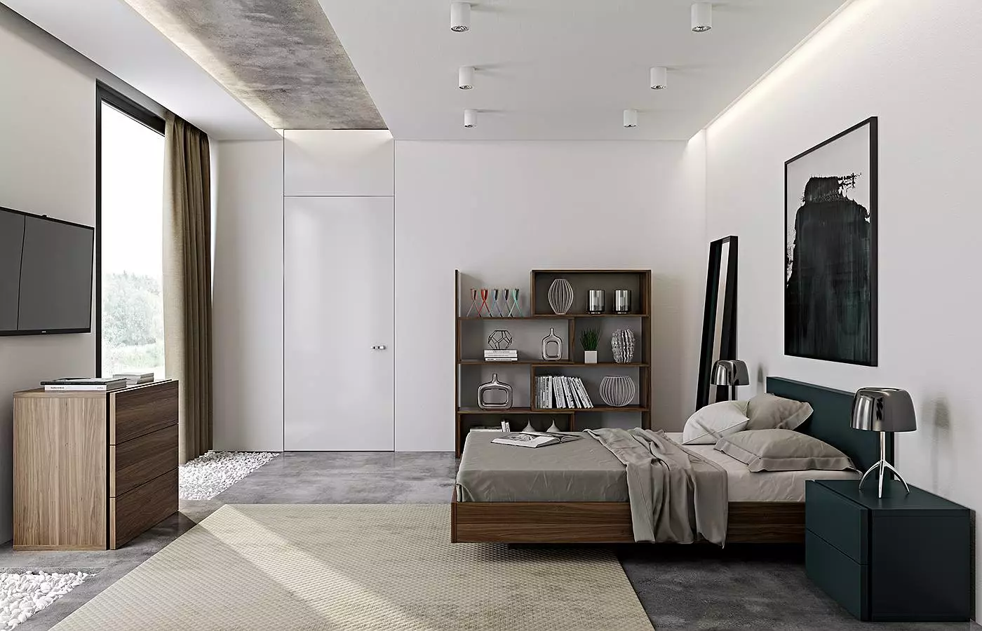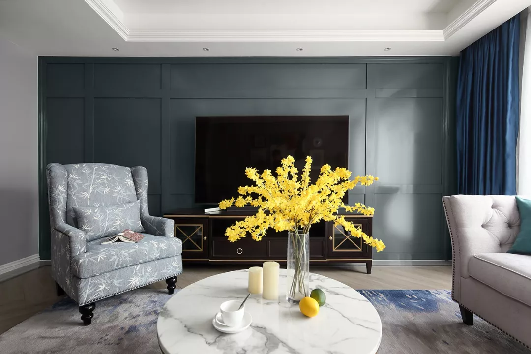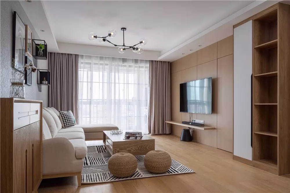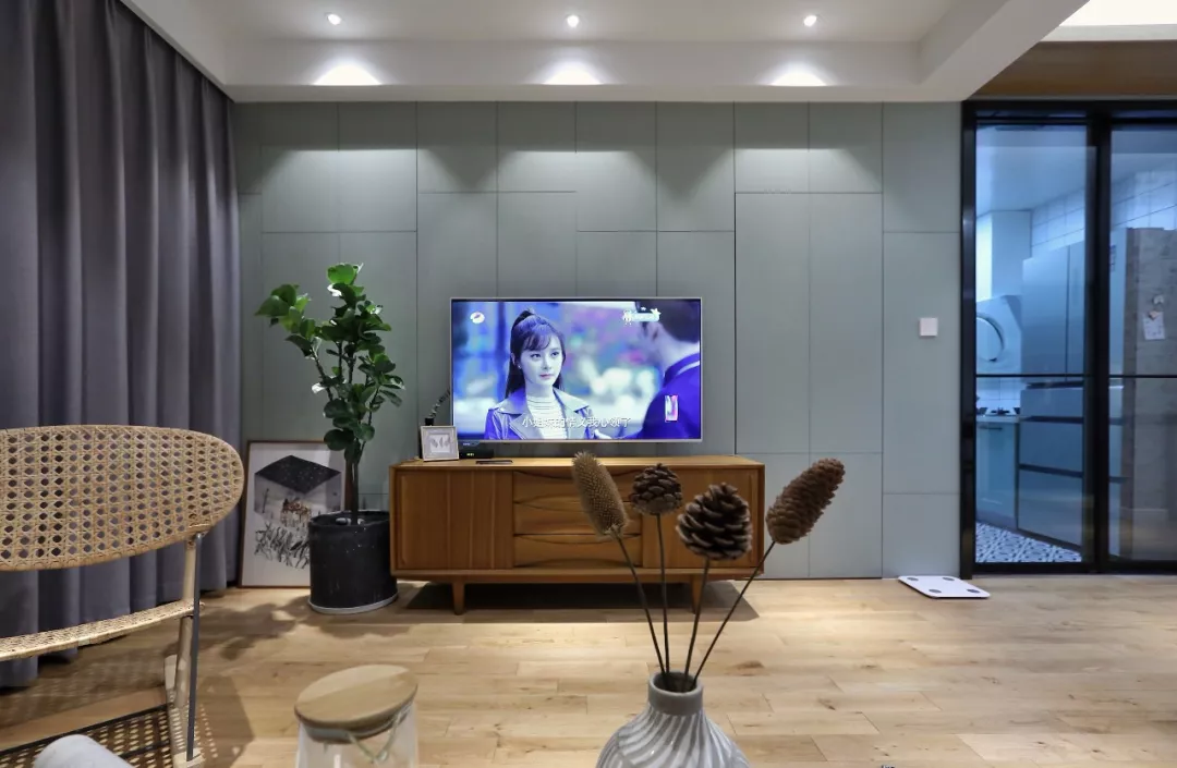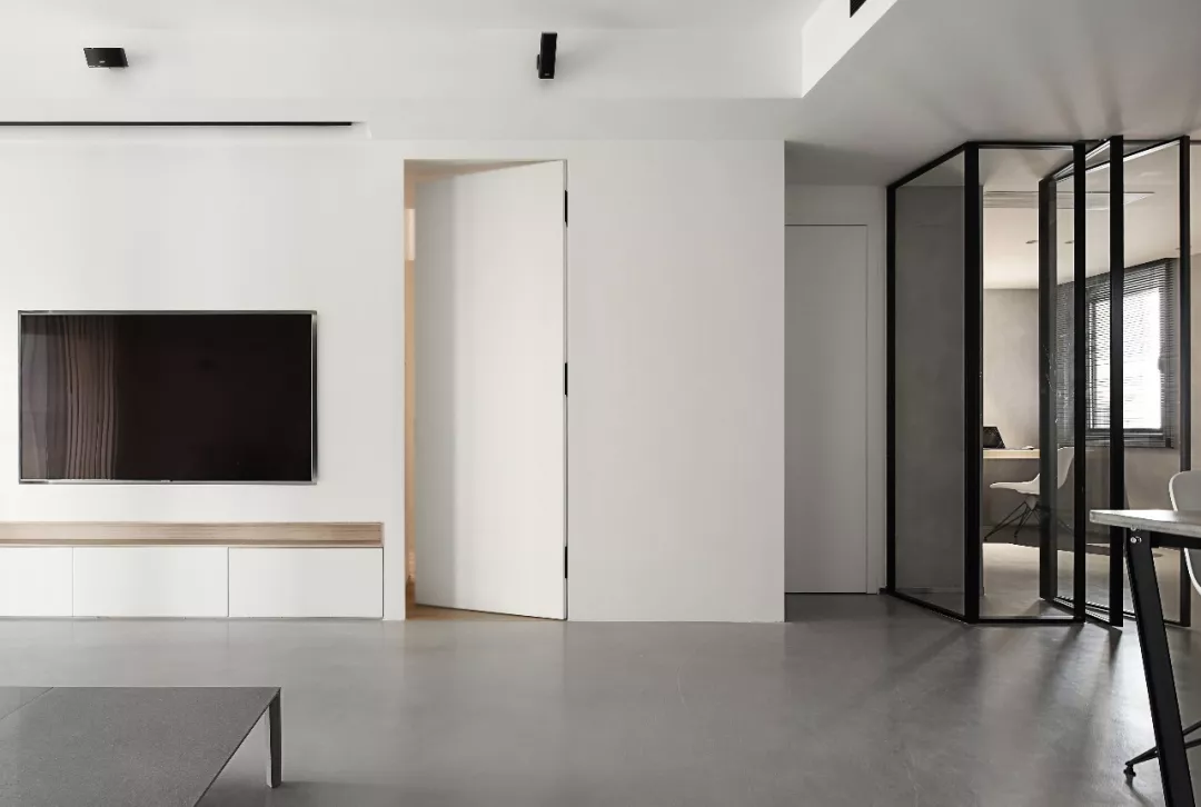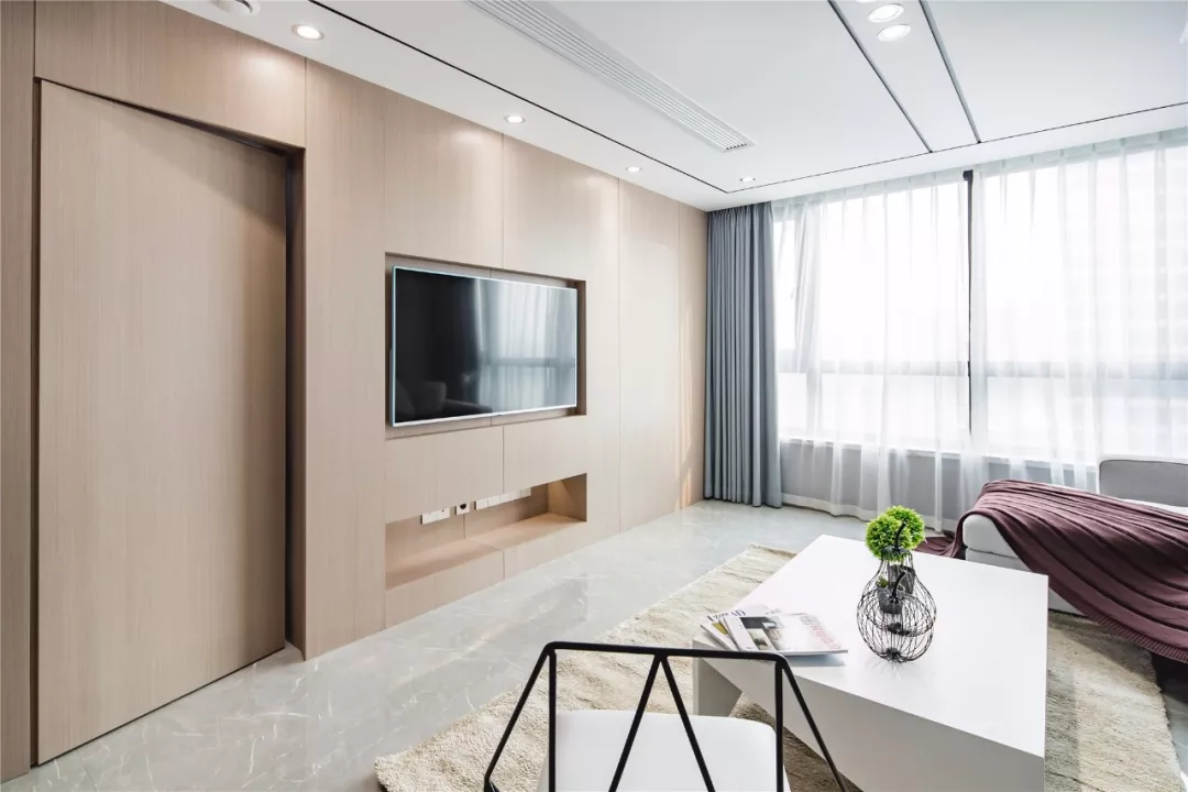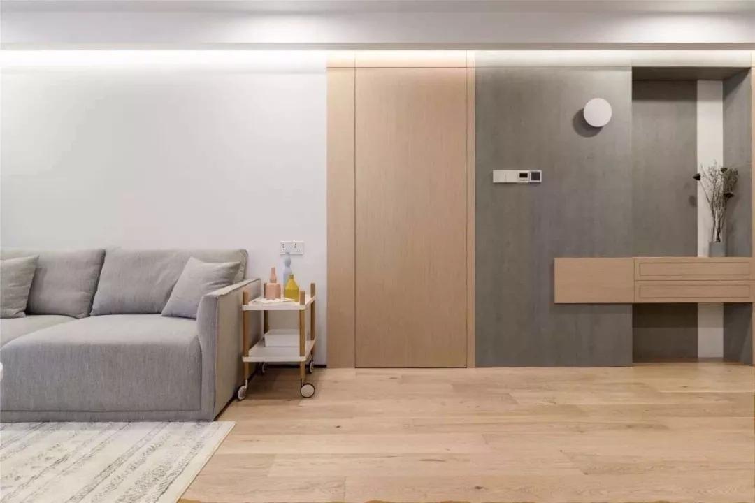 门开在电视背景墙上的户型,背景墙会显得很短,从而导致这个空间变得局促。在这里做上隐形门,门与背景墙成为了一个整体延展开来,视觉上空间也显得更大。